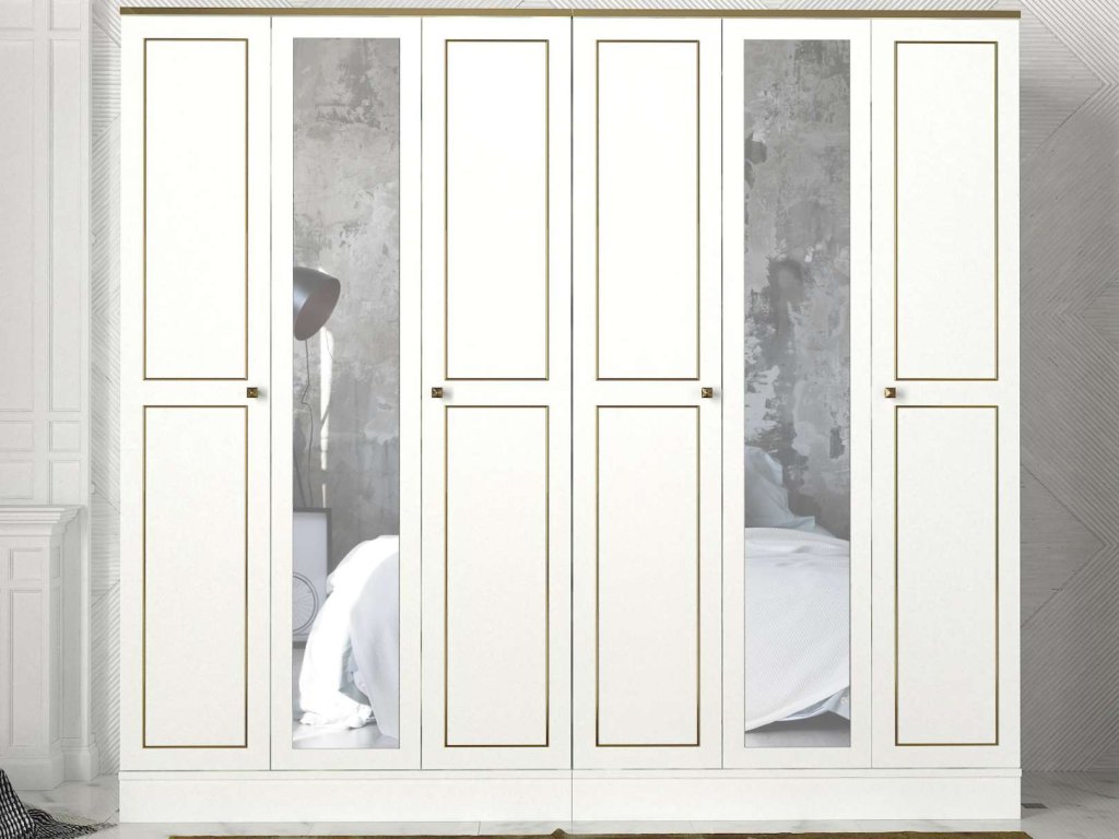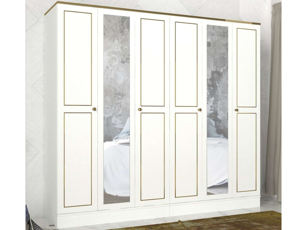 Šatníková skriňa RAVEN 6D vyniká svojim širokým a elegantným dizajnom v bielej farbe, ktorý dodá vašej spálni svieži a moderný vzhľad. Praktické vnútorné usporiadanie so štyrmi šatníkovými tyčami, štyrmi policami a zrkadlom ponúka dostatok úložného priestoru pre vaše oblečenie a ďalšie predmety, zatiaľ čo zrkadlo opticky zväčšuje priestor a dodáva interiéru hĺbku.