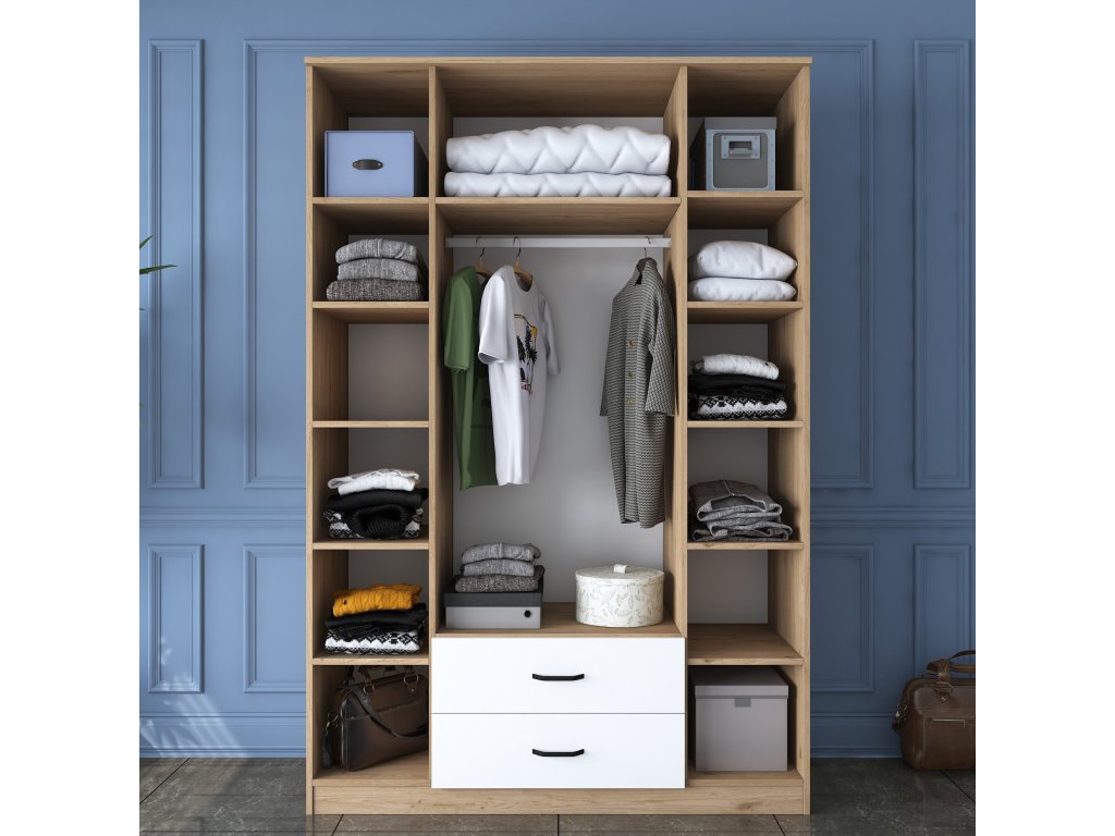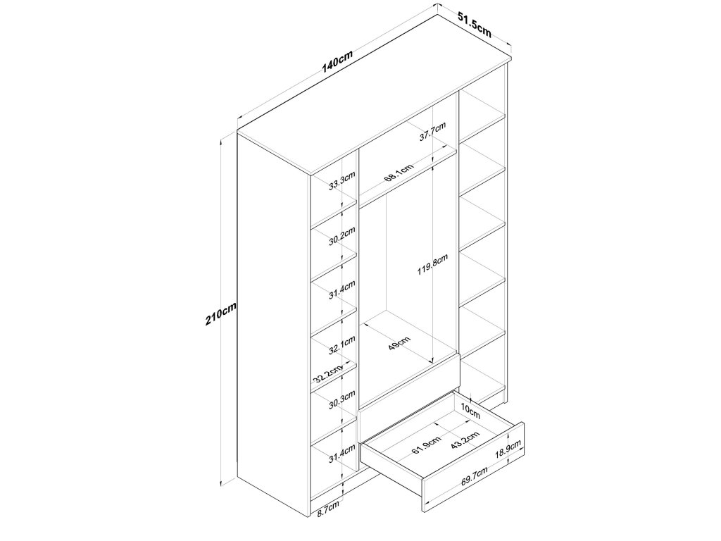 - Rozmery: 210 x 140 x 51,5 cm – priestranná skriňa, ktorá pojme všetko oblečenie a doplnky.