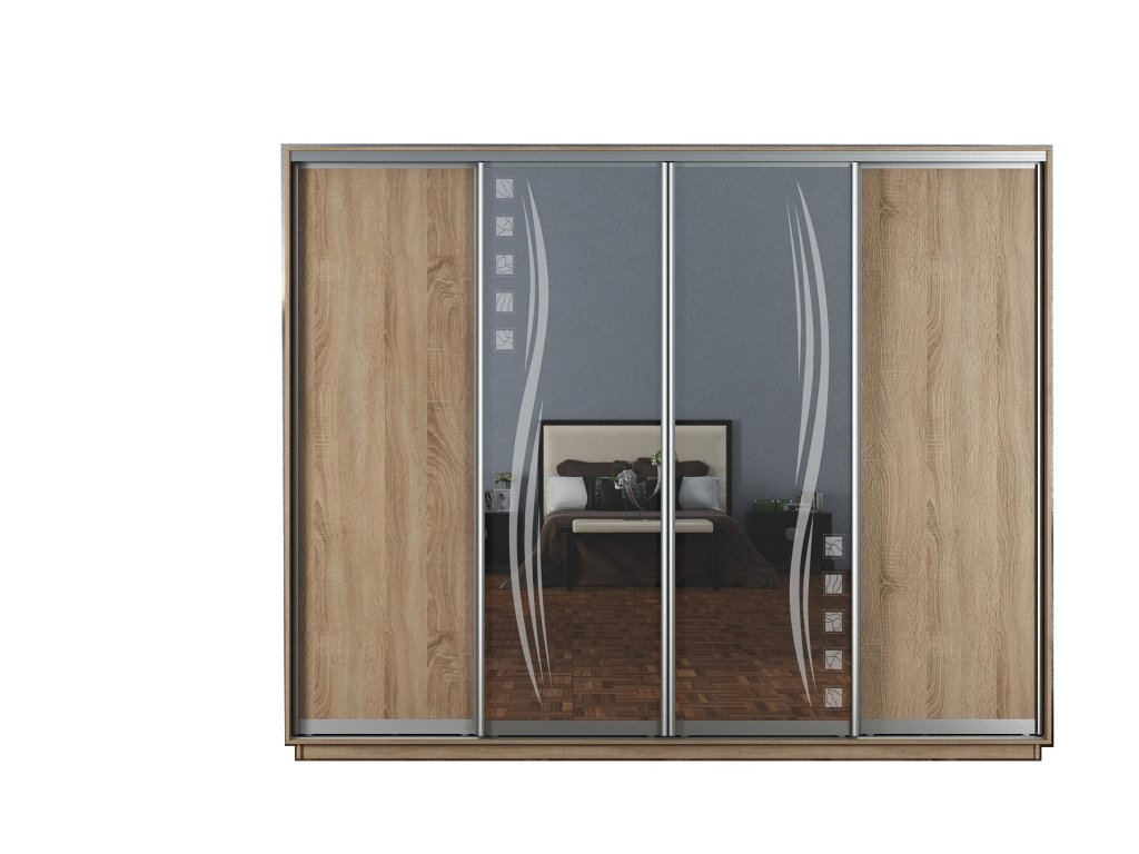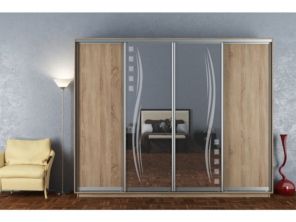 LASTELA je veľká šatníková skriňa so 4 posuvnými dverami. Túto skriňu Vám ponúkame v žiadanom farebnom prevedení dub sonoma. Korpus skrine je vo farbe dub sonoma, predná dverná časť je v kombinácii dub sonoma (2 dvere) a zrkadlo (2 dvere). Efektný vzor na zrkadle robí z tejto skrine výnimočný prvok. Skriňa je efektne prepojená s úchytmi a kovaním v striebornej farbe/alumínium. Netypická výška skrine až 220 cm zaistí väčší úložný priestor. Skriňa je členená na policovú a závesnú časť s 2 závesnými tyčami. Korpus skrine je vyrobený z kvalitnej LTD dosky. Pre komfortnejšie rozdelenie odkladacieho priestoru máte možnosť dokúpiť sadu 2 šuplíkov (viď odporúčame). Možnosť ich umiestnenia vidíte na priloženom nákrese. Rozmery v/š/h: 220 x 300 x 60 cm.