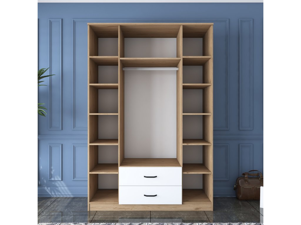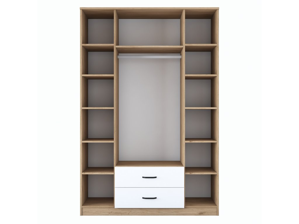 Šatníková skriňa LINE prináša kombináciu moderného dizajnu a praktického usporiadania. Spojenie bielej farby a orechového dekoru dodáva skrini elegantný vzhľad, ktorý sa stane ozdobou každej spálne. Vysoké prevedenie zaisťuje maximálne využitie priestoru.