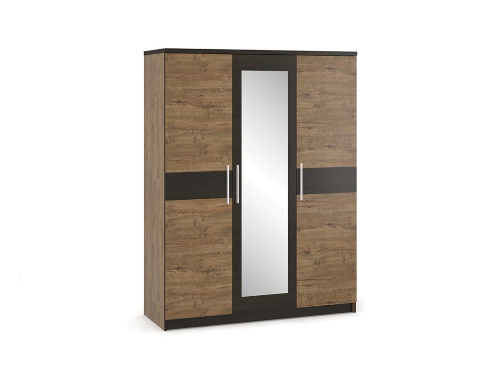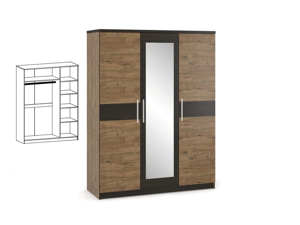 Moderný spálňový nábytok VALENTÍNA poskytne to pravé útočisko od všedných povinností a starostí. Svojou farebnou kombináciou dub april s tmavým kontrastom wenge zaistí nadčasovosť a štýlovosť. Sektor zahŕňa dostatok komponentov, vďaka ktorým si vytvoríte výnimočnú spálňu plnú pohodlia. Súčasťou spálne je šatníková skriňa VALENTÍNA. Skriňa je 3dverová, uprostred so zrkadlom. Má dostatok úložného priestoru, vo vnútri s jednou vešiakovou tyčou a 5 odkladacích políc. Je vyrobená z veľmi kvalitnej LTD dosky, ktorá sa ľahko udržuje. Farba je dub april/wenge. Šmrnc jej dodávajú elegantné úchyty striebornej farby. Rozmery: - šírka: 156 cm, - výška: 203,4 cm, - hĺbka: 56,3 cm. Dodávame v demonte, pričom montáž je veľmi jednoduchá.Dodatočné parametre