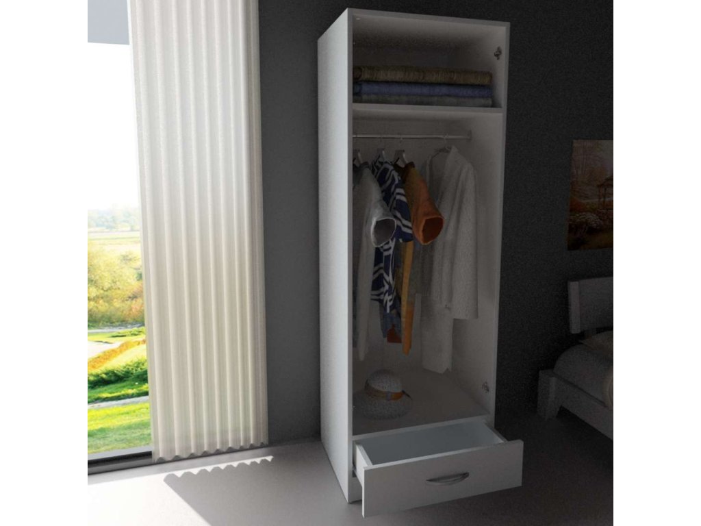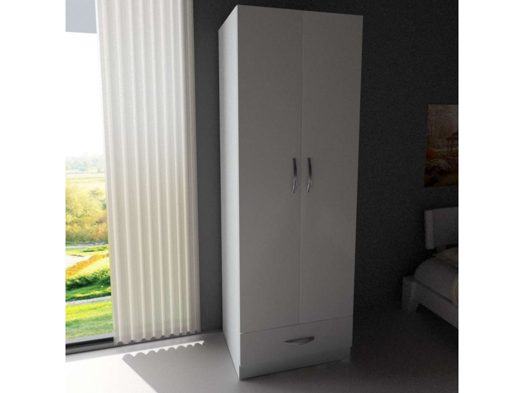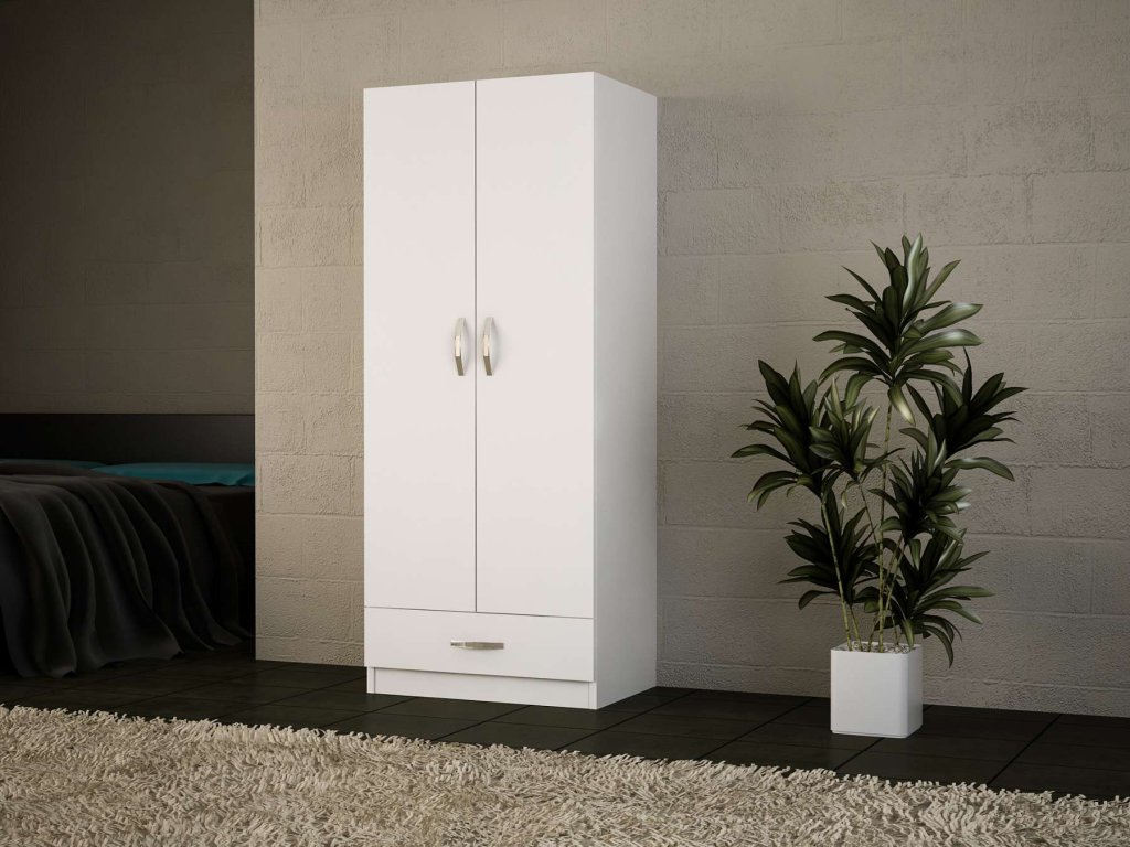 Šatníková skriňa VIDA 2D vyniká svojim škandinávskym dizajnom v bielej farbe, ktorý dodá vašej spálni svieži a moderný vzhľad. Praktické vnútorné usporiadanie s jednou šatníkovou tyčou, jednou zásuvkou a dvoma policami ponúka dostatok úložného priestoru pre vaše oblečenie a ďalšie predmety.