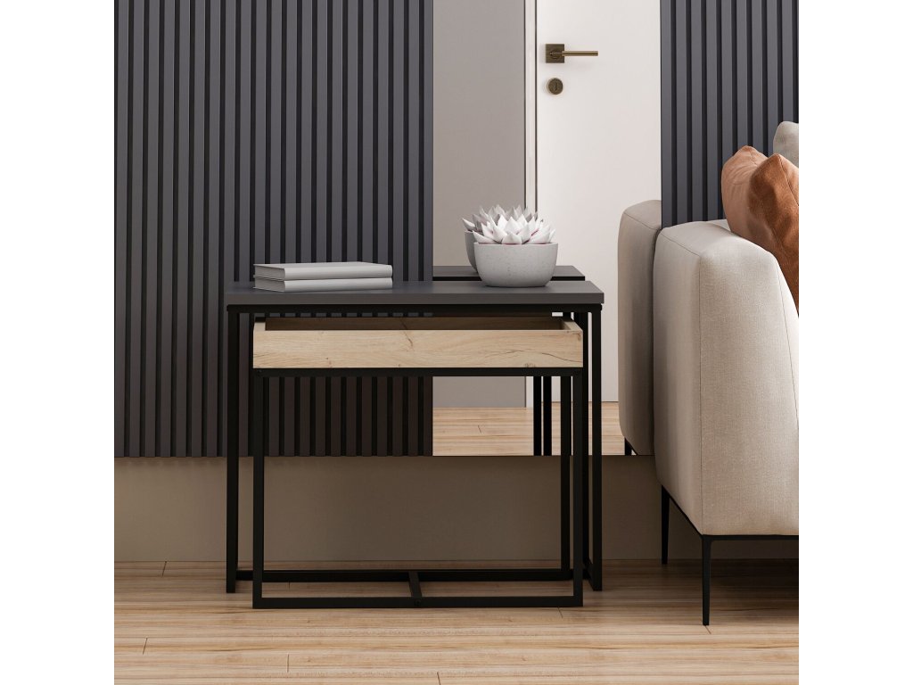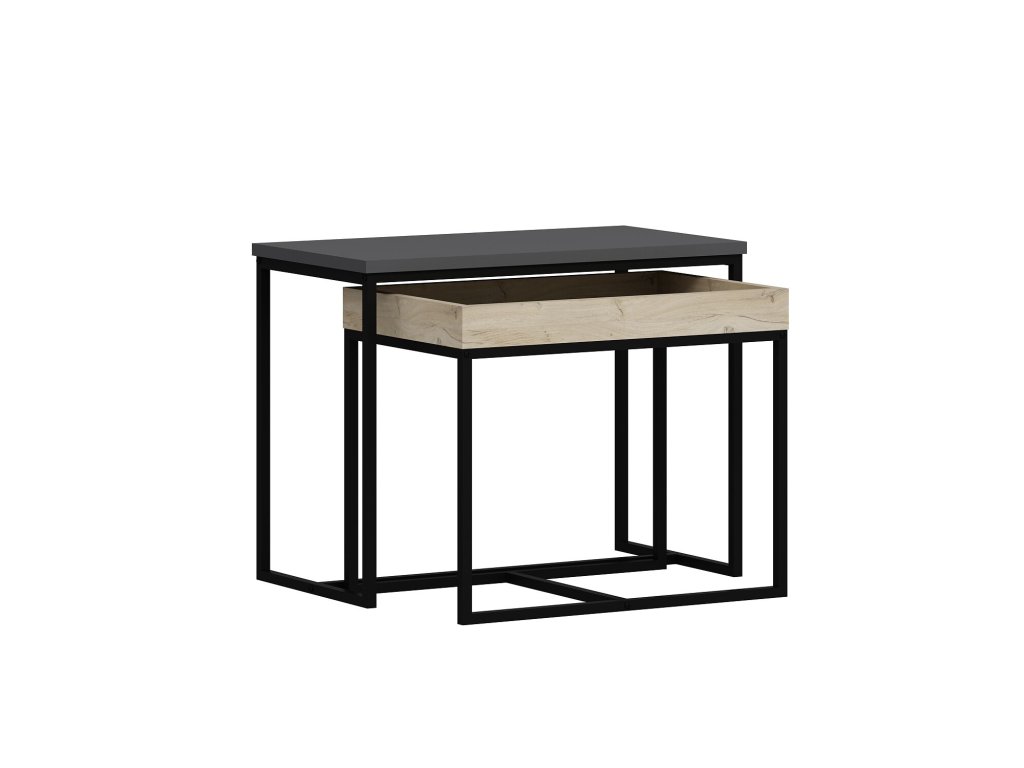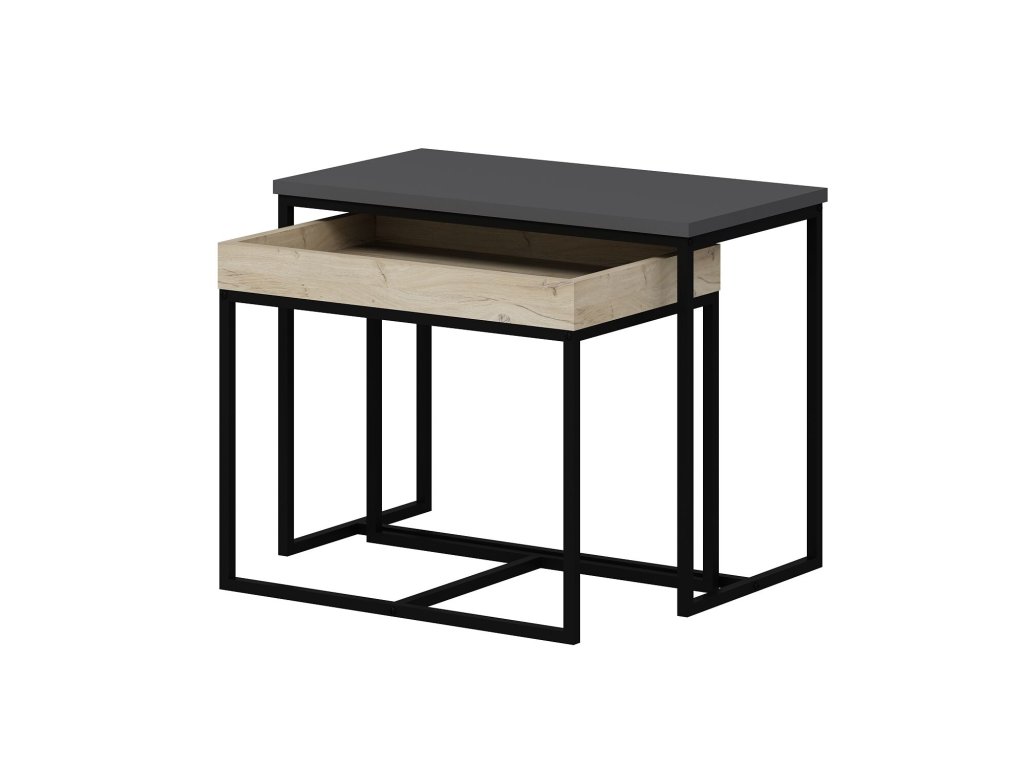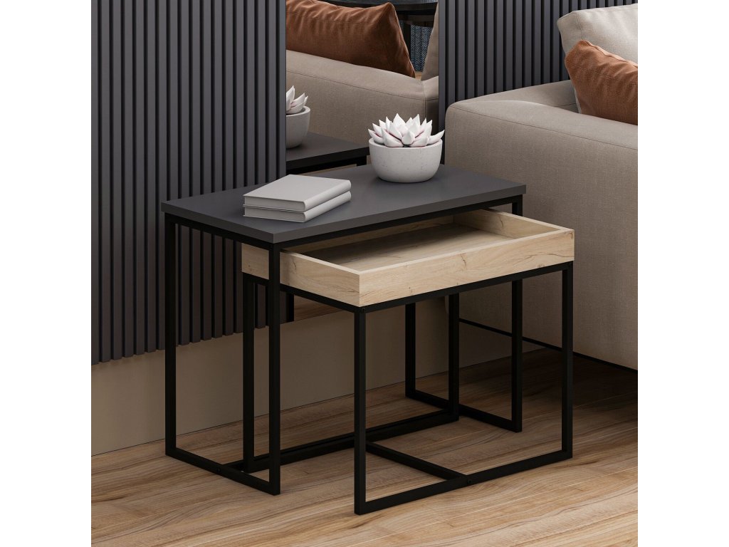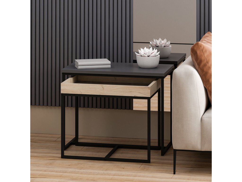 Konferenčný stolík SASHA je moderná a praktická sada dvoch stolíkov, ktoré sa dokonale hodia do každej obývacej izby. Táto zostava zahŕňa väčší stolík s rozmermi 65x35x50 cm a menší stolík, ktorého horná doska je navyše vybavená praktickými okrajmi. Antracitová farba dodáva stolíku elegantný vzhľad, ktorý podčiarkne moderný interiér.