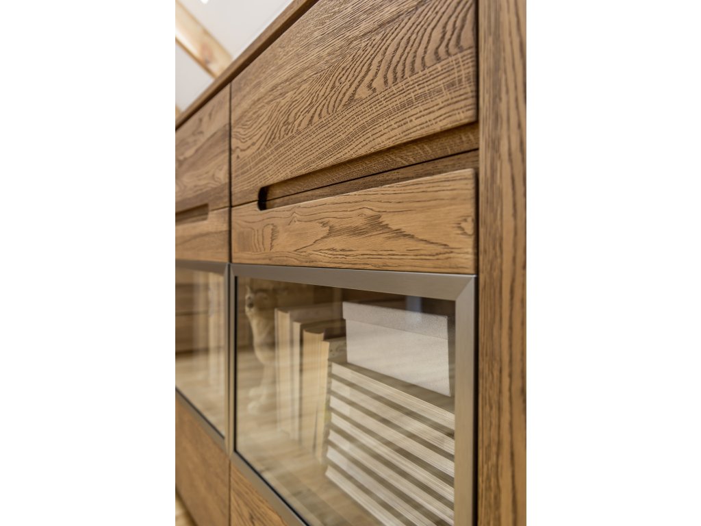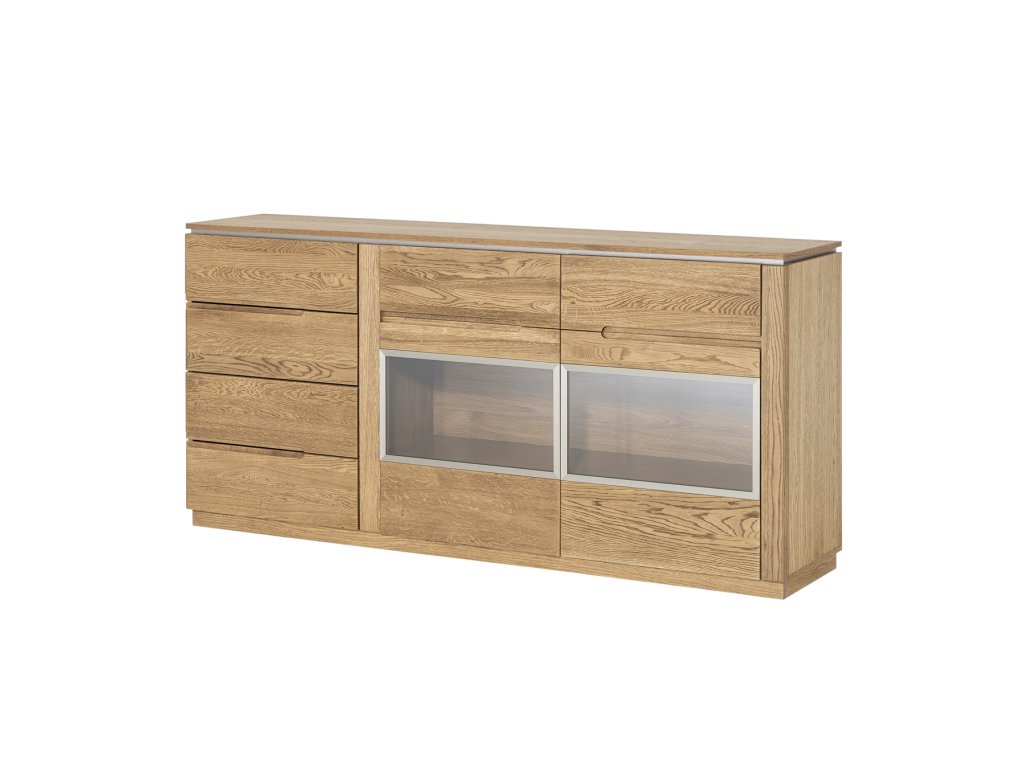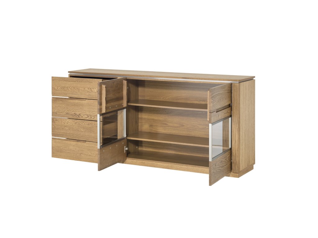 Široká 2-dverová komoda so 4-mi zásuvkami a s presklenenou časťou na oboch dvierkach MONASTERY, Vám zaručí kvalitné spracovanie a moderný dizajn. Dvierka nábytku sú vyrobené z pravého masívneho dreva. Zadná časť nábytku je vyrobená z prírodnej dubovej dýhy, vnútro je štandardne vyrobené z kvalitnej LTD dosky, ktorá je potiahnutá odolnou fóliou. Povrch nábytku je natretý ochranným ekologickým lakom. Vnútro je tvorené policami. Komodu je možné podsvietiť LED svetlami, ktoré je potrebné si samostatne dokúpiť (viď. Doporučené produkty). Ku komode je možné dokúpenie ďalších elementov z toho istého sektoru, čím si môžete zostaviť obývačku alebo jedálňu podľa svojich predstáv a potrieb. Dodávame v demontovanom stave.Dodatočné parametre