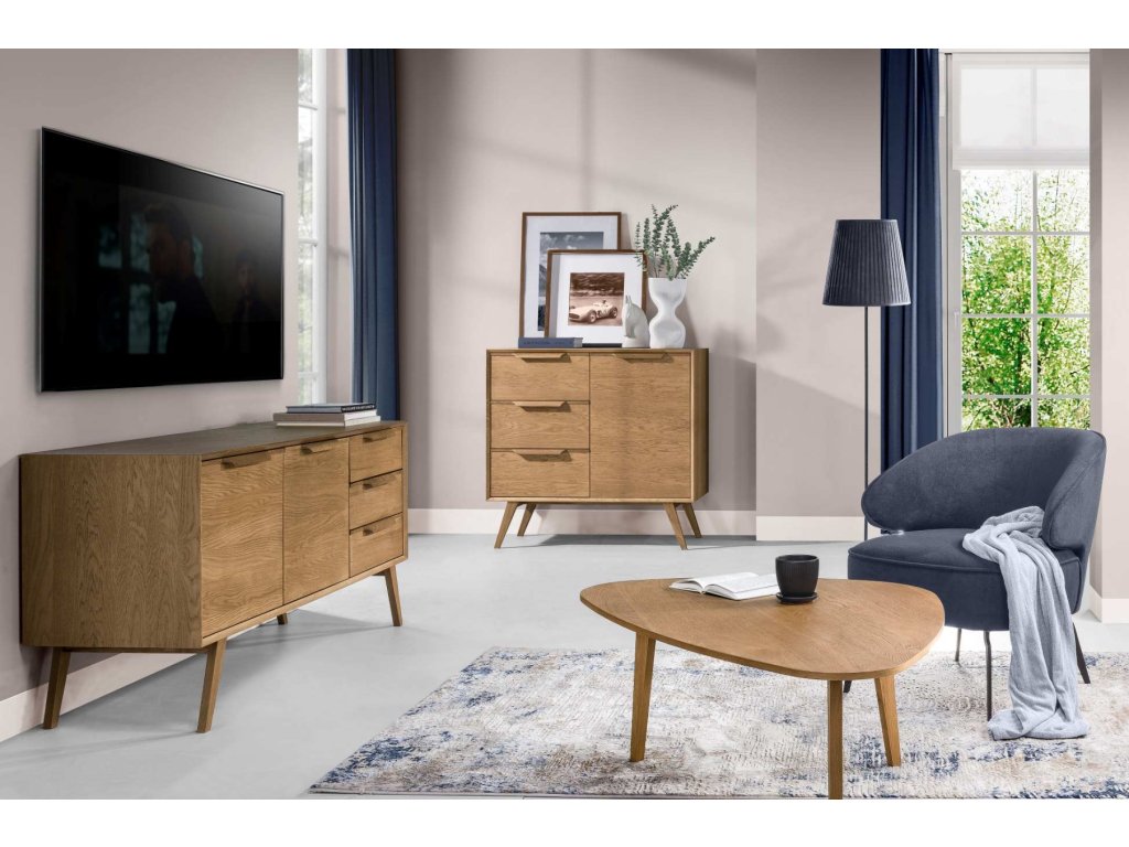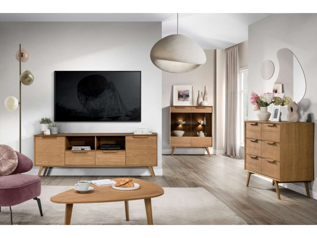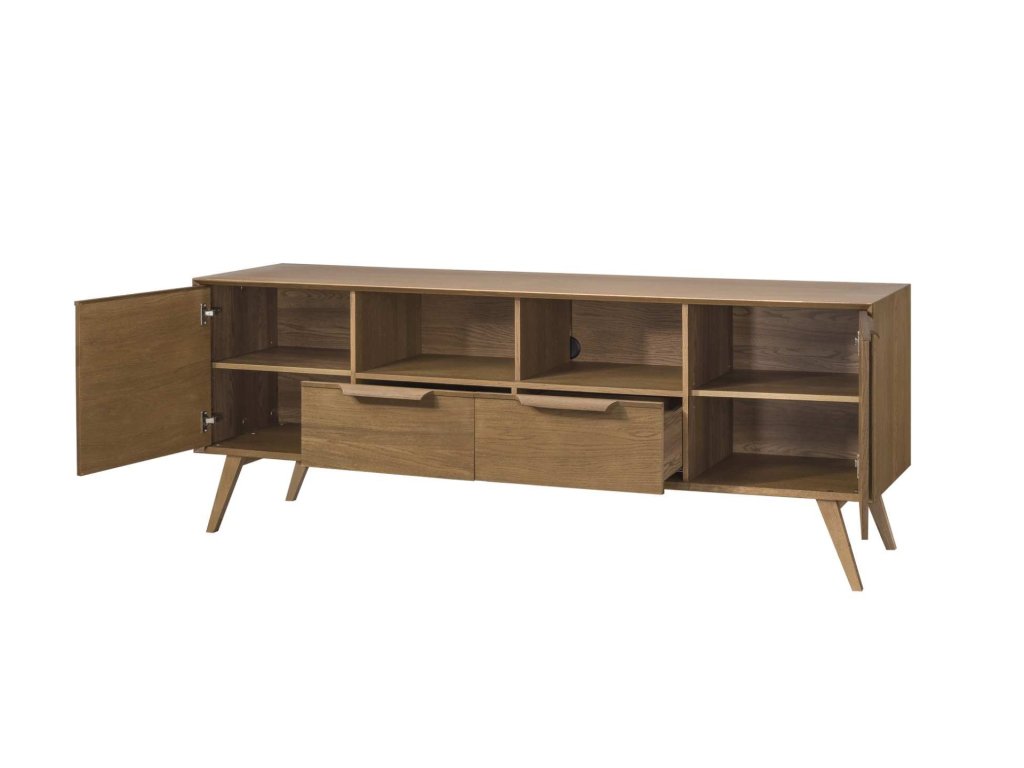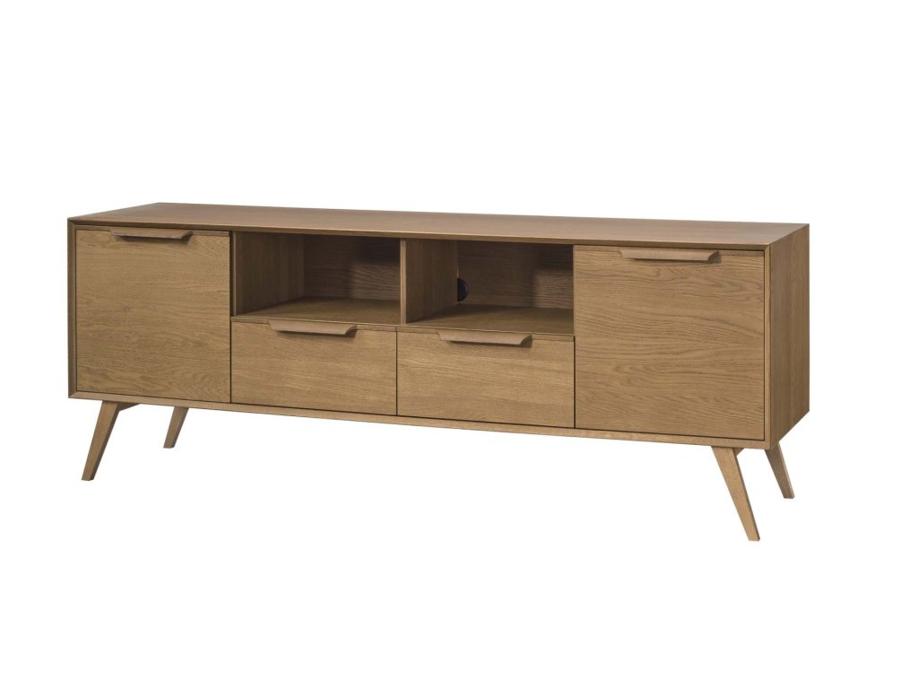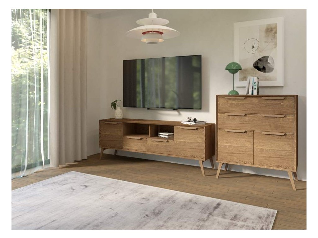 Komoda je kombinovaná, dvojdverová. Disponuje dvomi praktickými zásuvkami. Je vhodná pod televízor. Farebné prevedenie: dub Rustikálny.