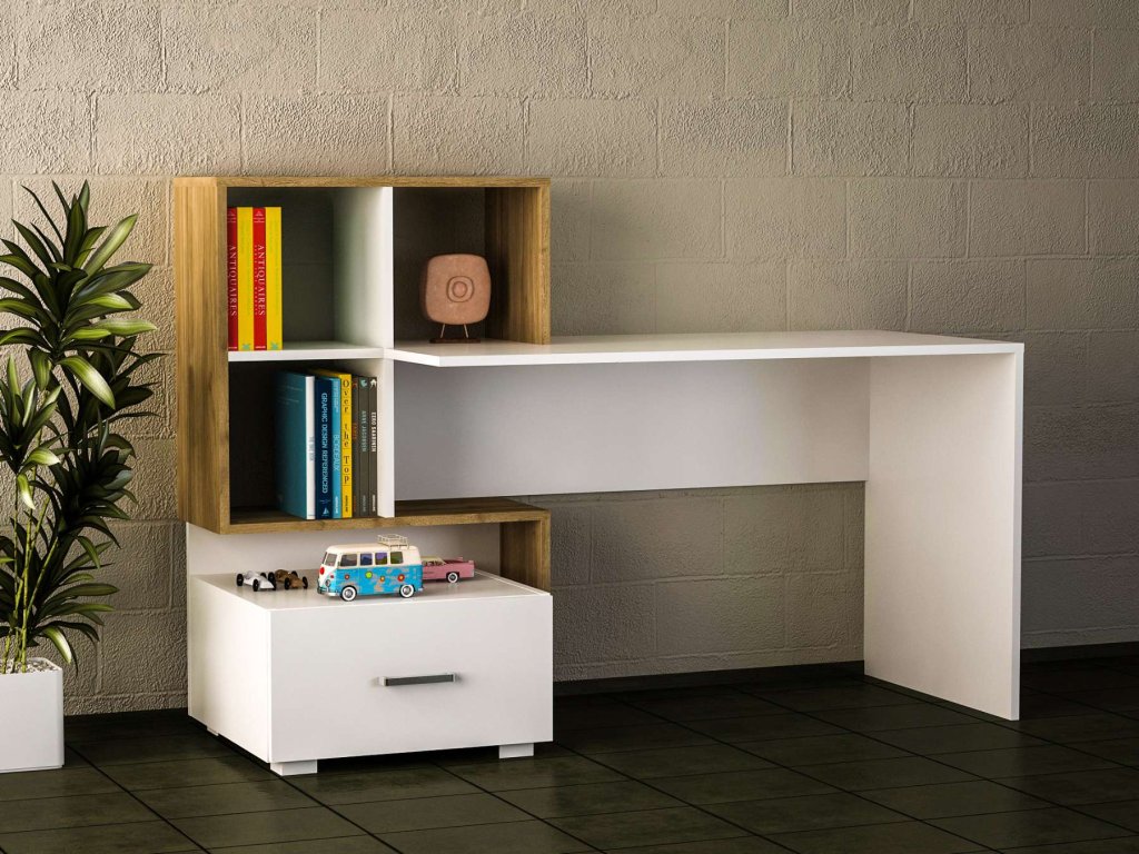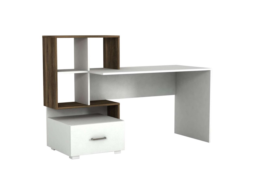 Písací stôl GLUM je vyrobený z kvalitného LTD materiálu s hrúbkou 18 mm, čo zaisťuje jeho pevnosť a dlhú životnosť. Elegantná kombinácia bielej a orechovej farby dodáva stolu moderný a štýlový vzhľad, ktorý sa hodí do akéhokoľvek interiéru. Stôl je vybavený praktickým regálom a jednou zásuvkou, ktoré poskytujú dostatok úložného priestoru pre vaše pracovné potreby a pomôcky.