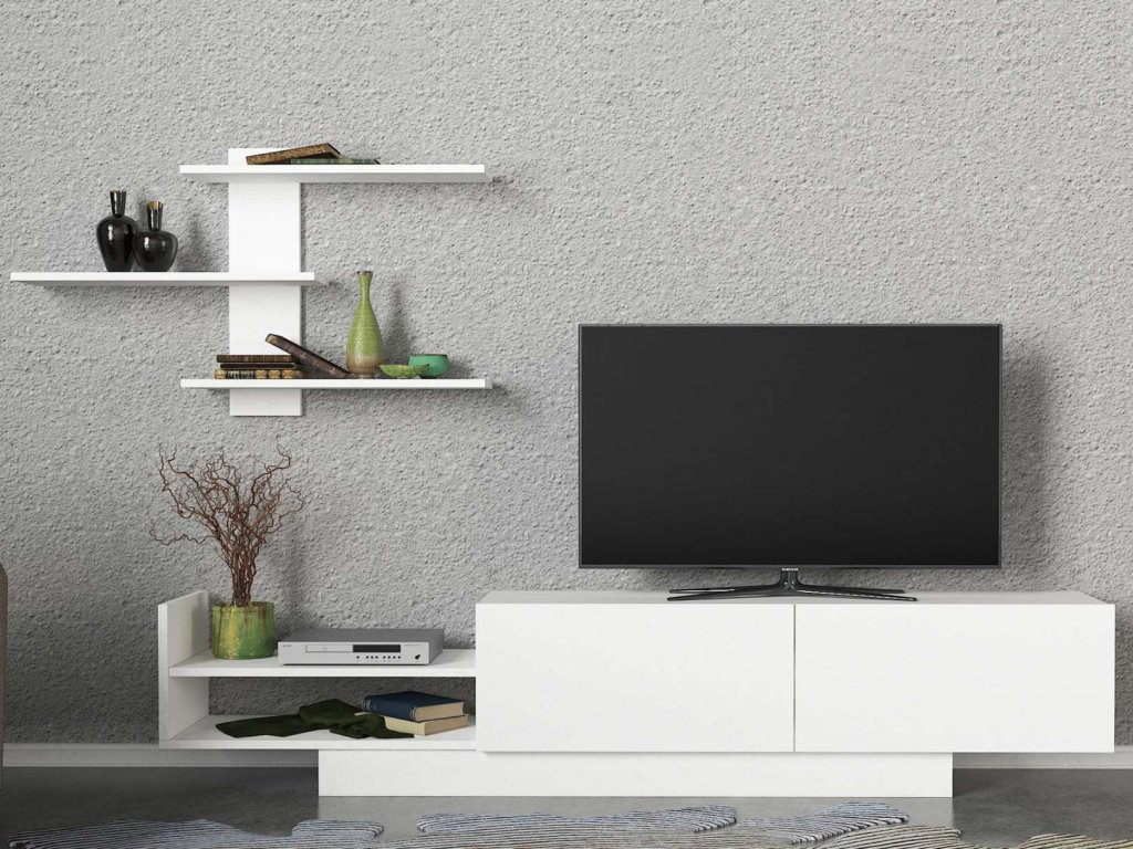 - Rozmery: TV stolík (180 x 31.8 x 40 cm) a nástenná polica (95.5 x 22.3 x 60 cm), poskytujúca účinné riešenie pre usporiadanie vašej elektroniky a dekoratívnych prvkov.