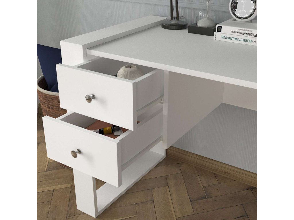 Písací stôl SULTAN je vyrobený z kvalitného LTD materiálu s hrúbkou 18 mm, čo zaisťuje jeho pevnosť a dlhú životnosť. Elegantný biely dizajn v škandinávskom štýle dodáva stolu moderný a čistý vzhľad, ktorý sa hodí do akéhokoľvek interiéru. Stôl je vybavený dvoma praktickými zásuvkami, ktoré poskytujú dostatok úložného priestoru pre vaše pracovné potreby a pomôcky.