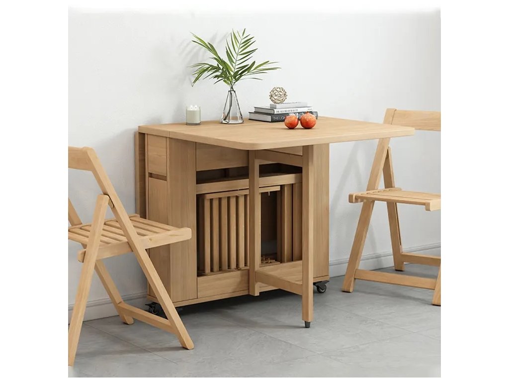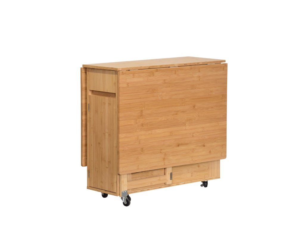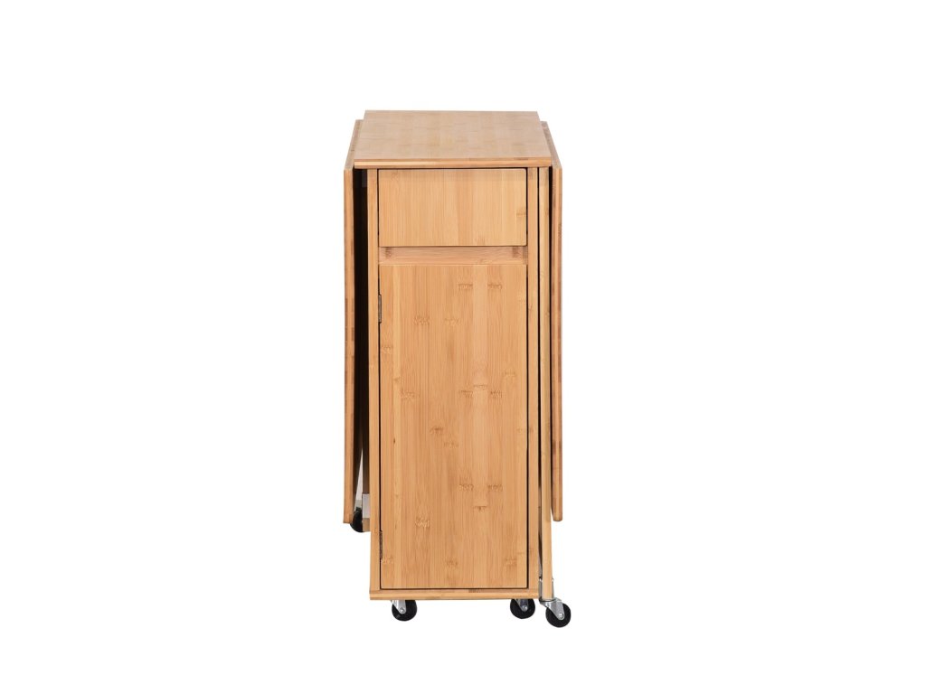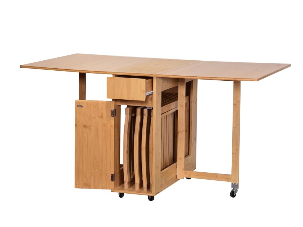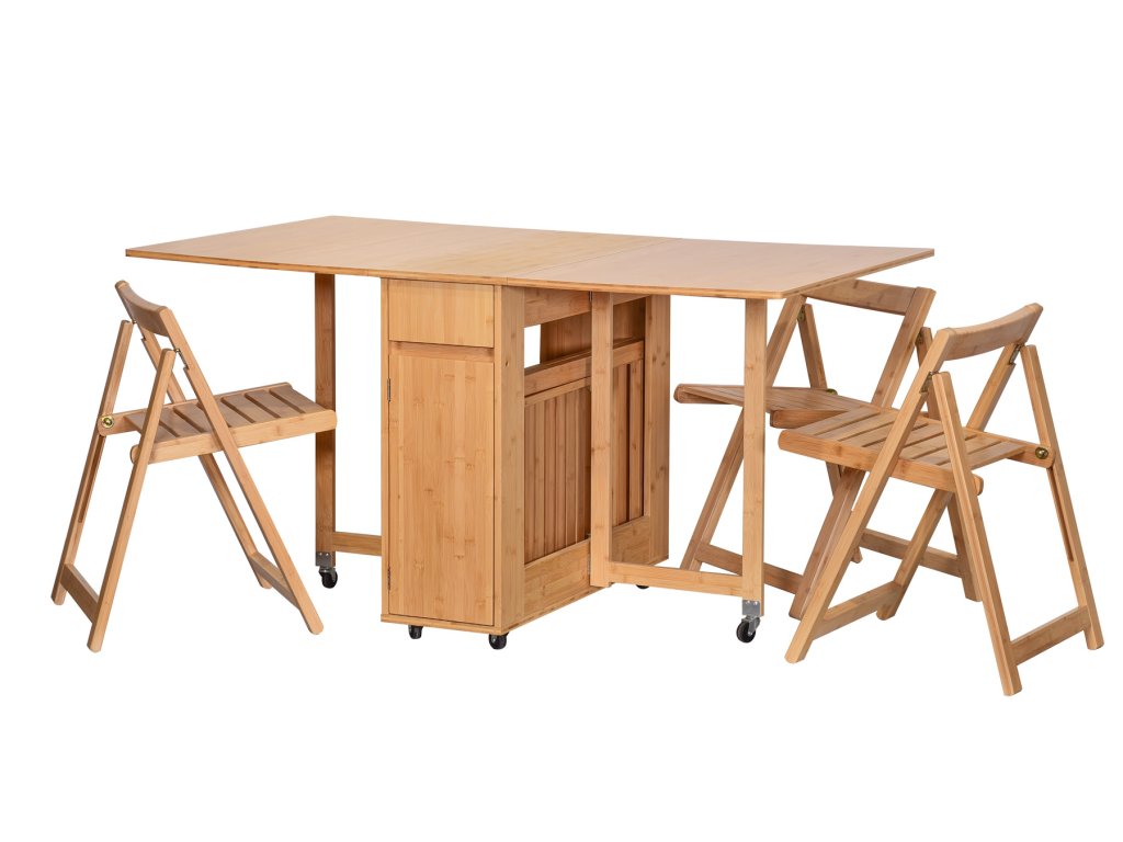 Praktický skladací jedálenský set GONSA je ideálny na príležitostné stolovanie v interiéri i exteriéri. Skladá sa zo stola a štyroch stoličiek, ktoré sú vyrobené z kvalitného bambusu. Stoličky sa dajú prakticky zložiť a uschovať vo vnútri stola. Jedálenský set je odolný voči poškodeniu a vonkajším vplyvom. Vďaka funkcii skladania tento jedálenský set jednoducho zložíte do minimálnych rozmerov a odložíte na ďalšie použitie. Jednoduché prenášanie Vám uľahčia aj praktické kolieska upevnené zo spodu stola.
