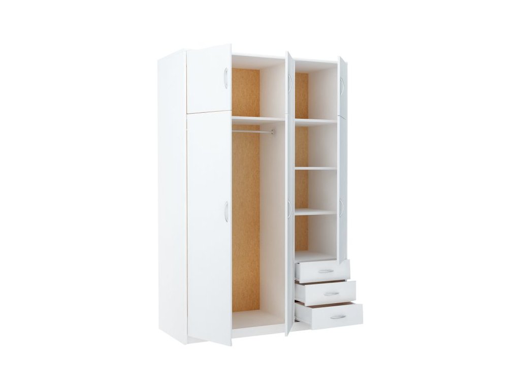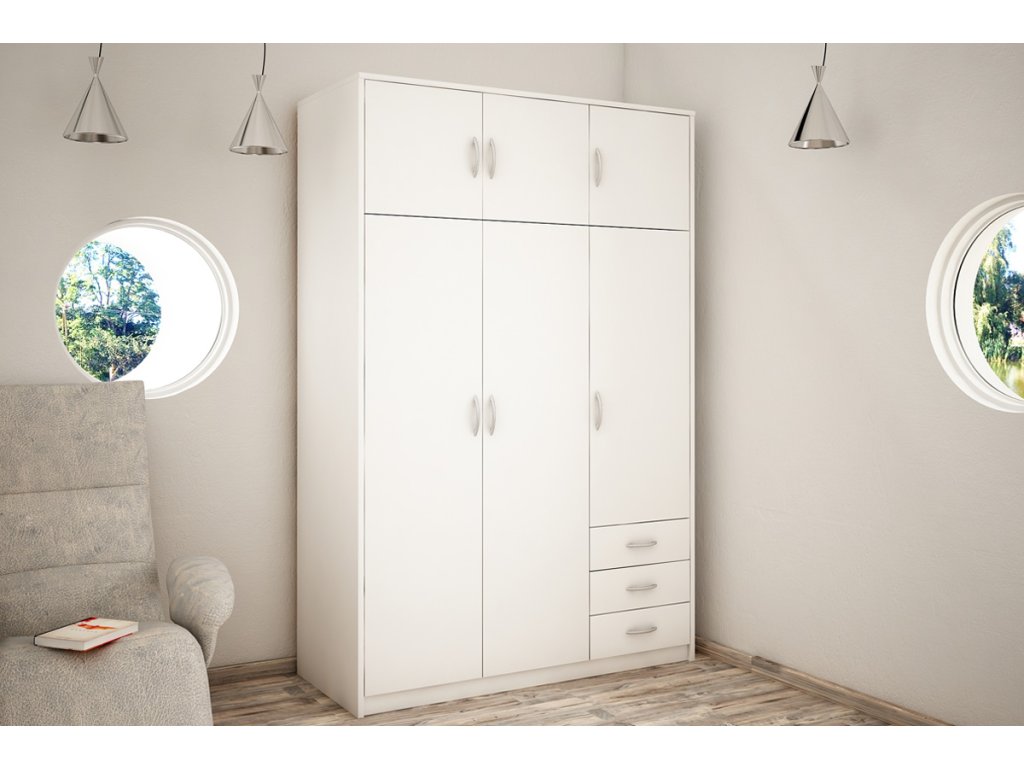 6-dverová šatníková skriňa VILMA Vám poskytne množstvo úložného priestoru. K dispozícií máte vešiakovú tyč, 5 priestranných políc a 3 zásuvky. Skriňa je vyrobená z kvalitnej LTD dosky. Korpus skrine a takisto jej dvierka a zásuvky sú v obľúbenom farebnom prevedení biela. K dispozícií máte ďalších 6 farebných prevedení na výber. Pojazdy v zásuvkách sú kovové s plastovými koliečkami. Úchytky sú z plastu vo farbe alumínium oblého tvaru. Dodávame v demontovanom stave.Dodatočné parametre