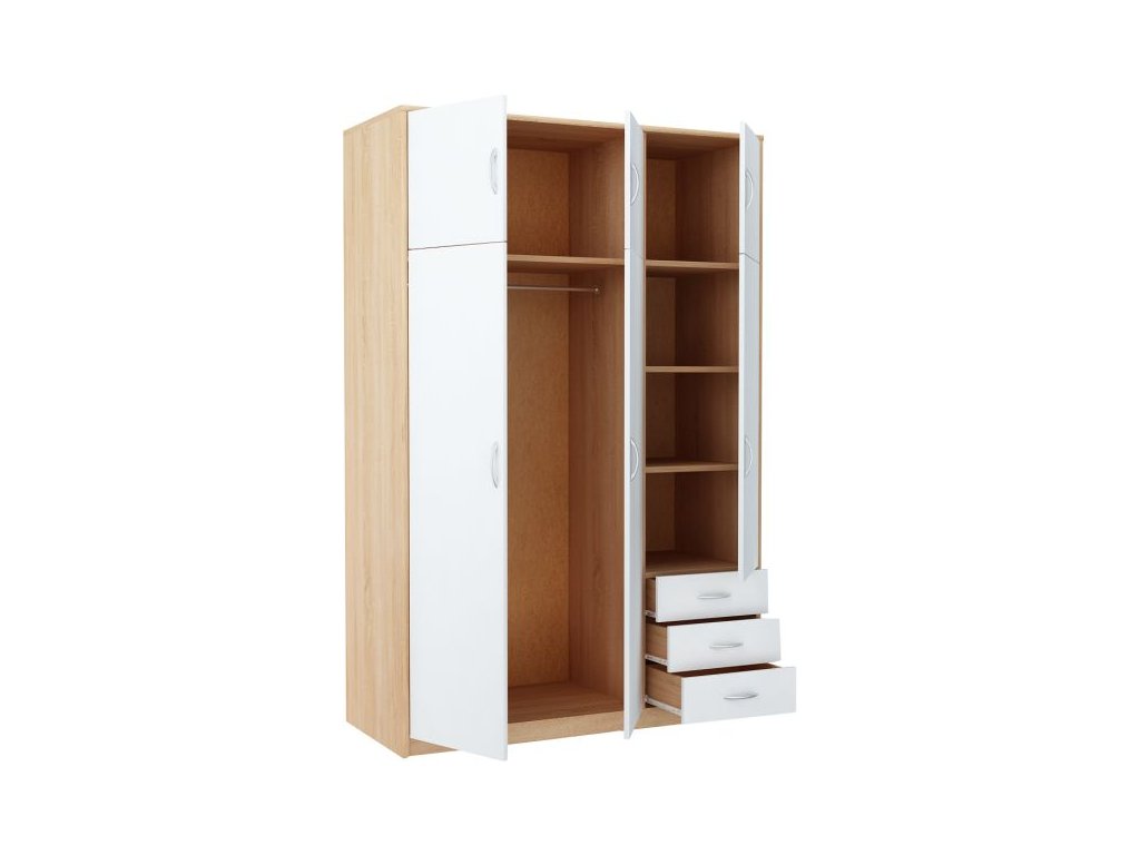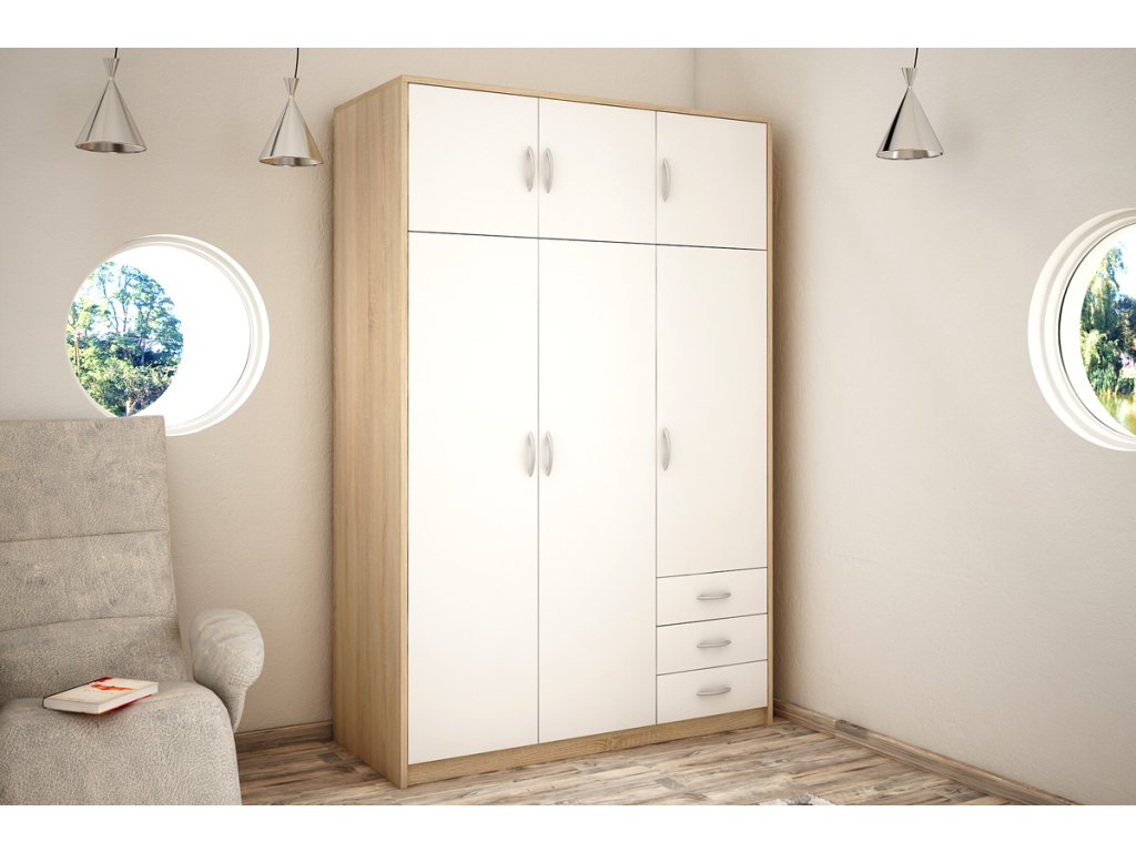 6-dverová šatníková skriňa VILMA Vám poskytne množstvo úložného priestoru. K dispozícií máte vešiakovú tyč, 5 priestranných políc a 3 zásuvky. Skriňa je vyrobená z kvalitnej LTD dosky. Korpus skrine je v obľúbenom farebnom prevedení dub sonoma, dvierka a zásuvky sú v bielej farbe. K dispozícií máte ďalších 6 farebných prevedení na výber. Pojazdy v zásuvkách sú kovové s plastovými koliečkami. Úchytky sú z plastu vo farbe alumínium oblého tvaru. Dodávame v demontovanom stave.Dodatočné parametre