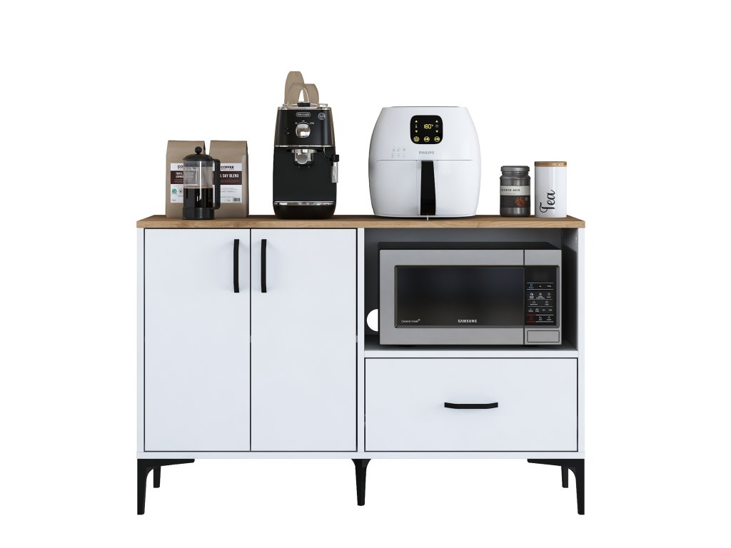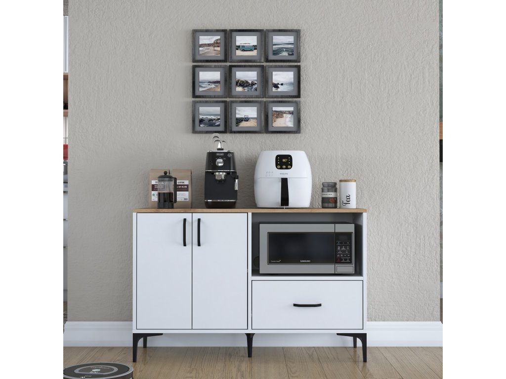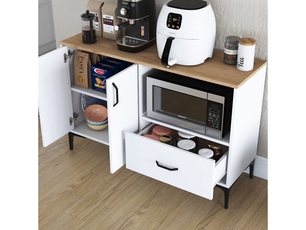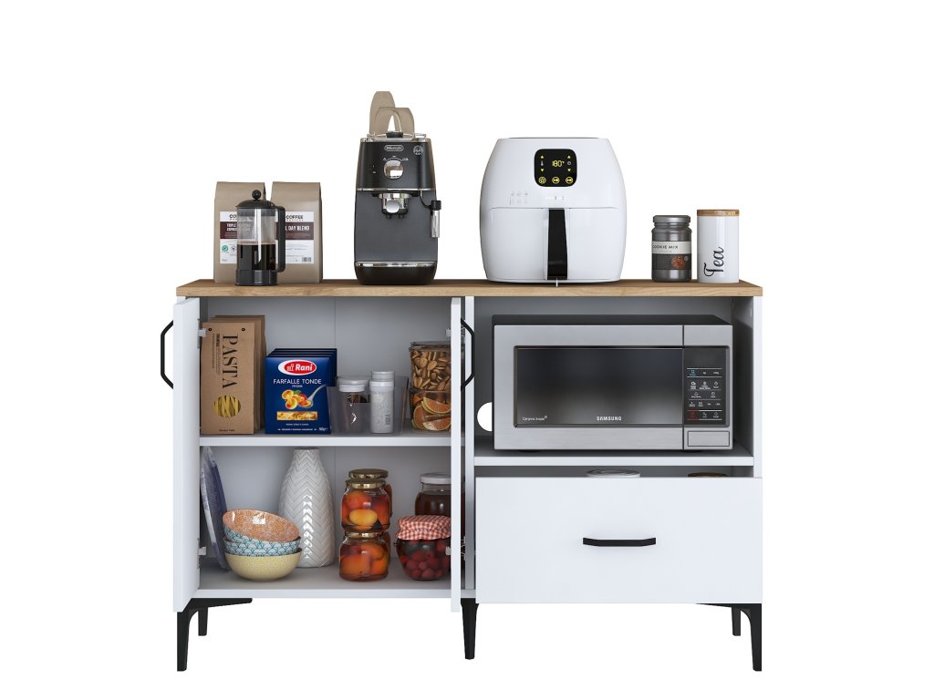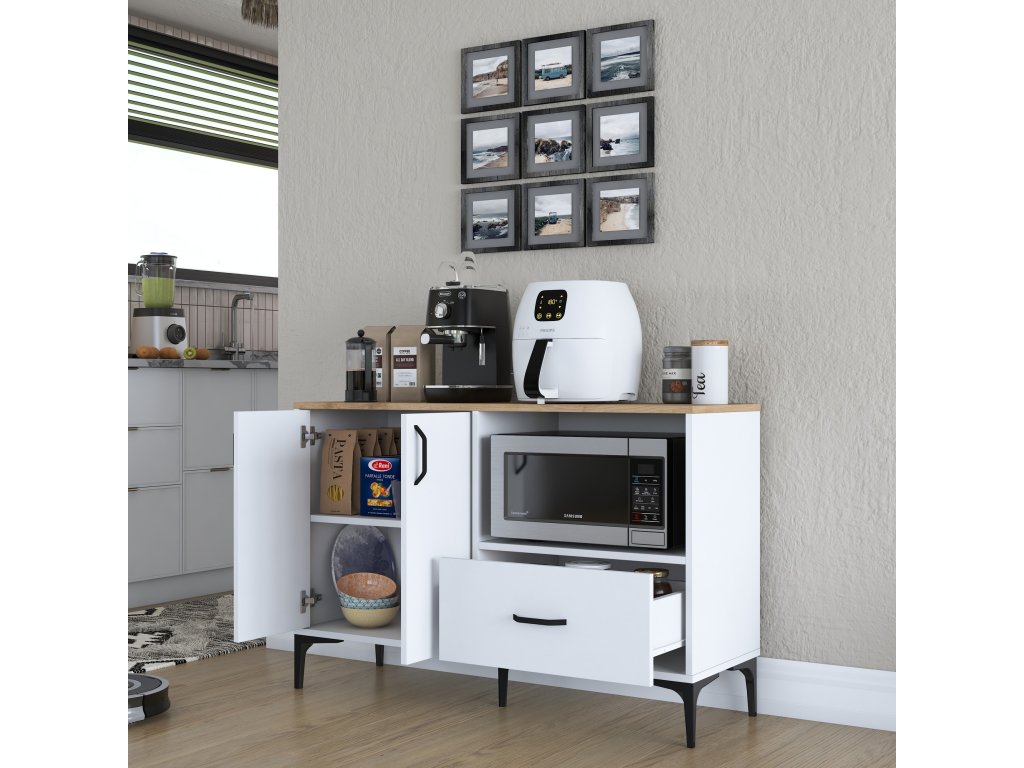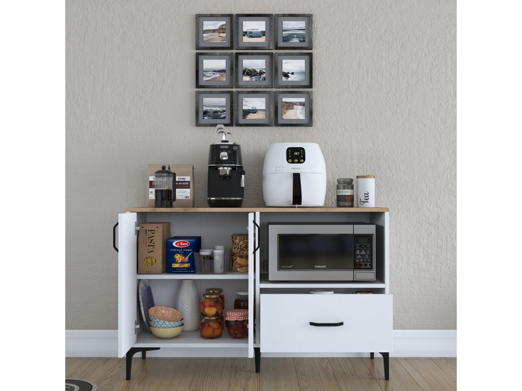 Skrinka KICK je ideálna na umiestnenie mikrovlnnej rúry, a pritom ponúka ďalšie praktické úložné priestory. Je vybavená dvoma plnými dvierkami, jednou zásuvkou a otvoreným regálom pre ľahký prístup k často používaným predmetom. Vysoko kvalitné materiály, ako melamín a VT laminát, zaručujú dlhú životnosť a jednoduchú údržbu.