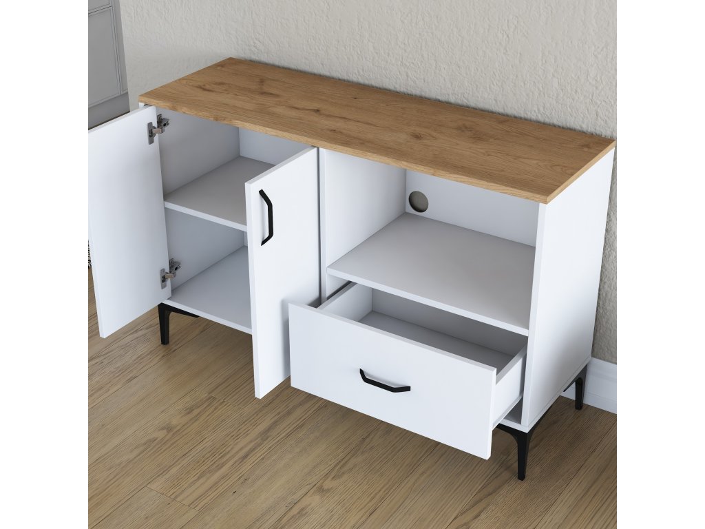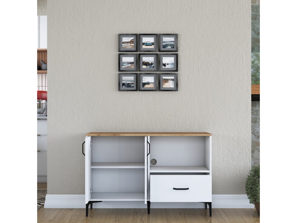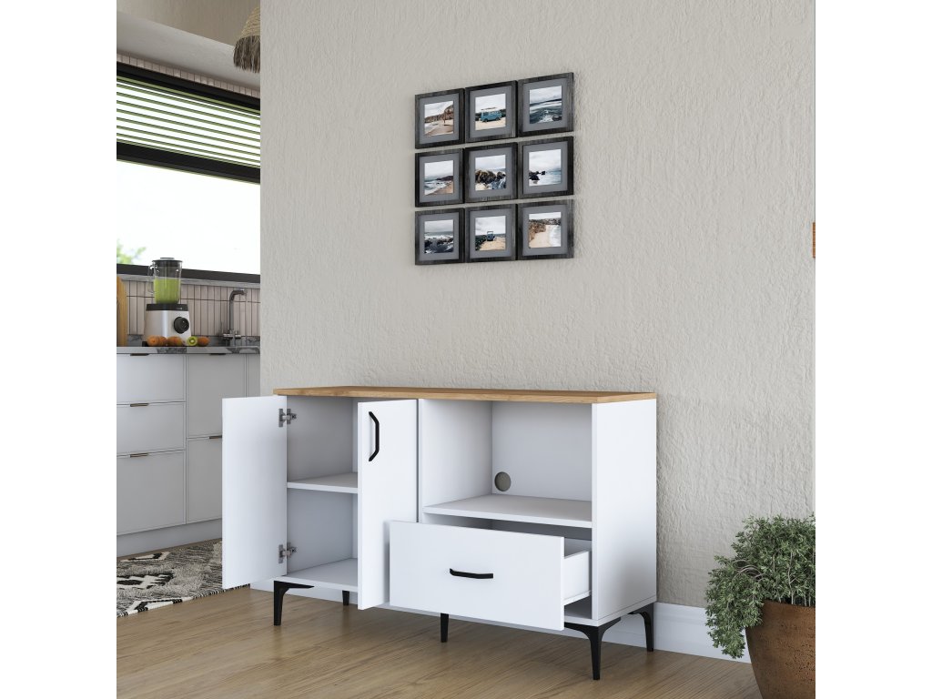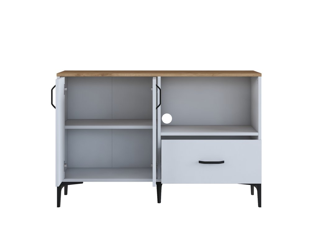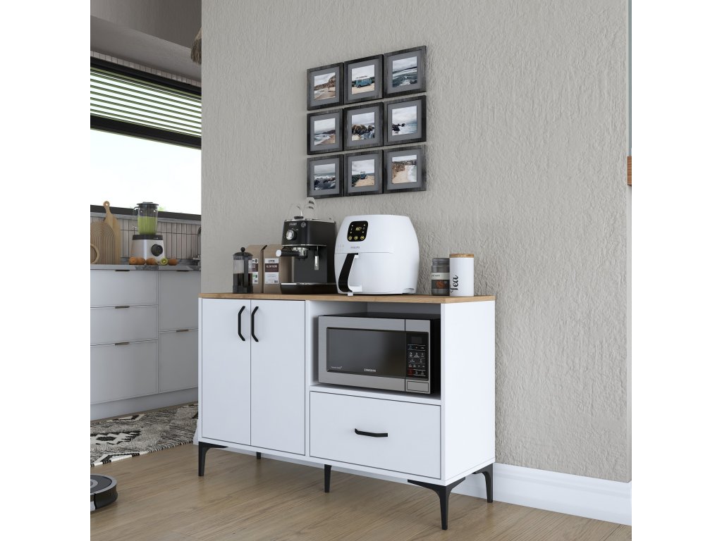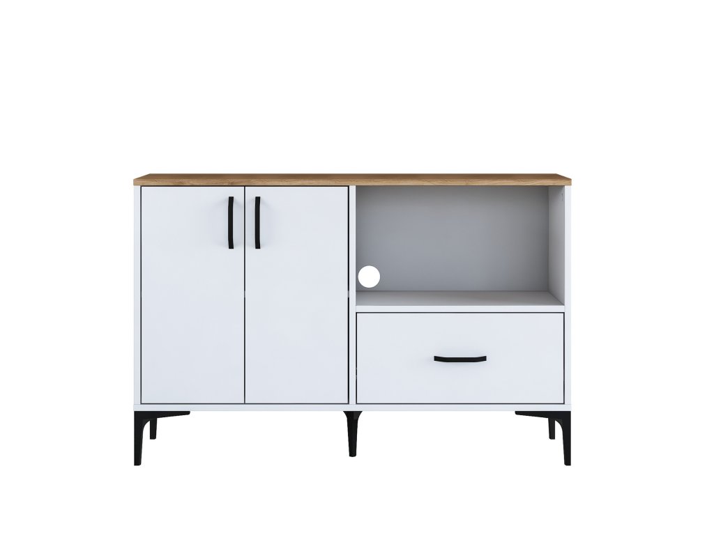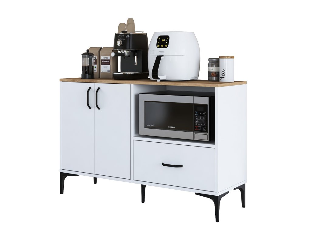 Skrinka KICK je ideálna na umiestnenie mikrovlnnej rúry, a pritom ponúka ďalšie praktické úložné priestory. Je vybavená dvoma plnými dvierkami, jednou zásuvkou a otvoreným regálom pre ľahký prístup k často používaným predmetom. Vysoko kvalitné materiály, ako melamín a VT laminát, zaručujú dlhú životnosť a jednoduchú údržbu.