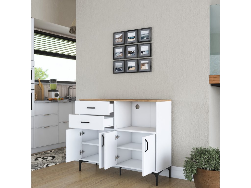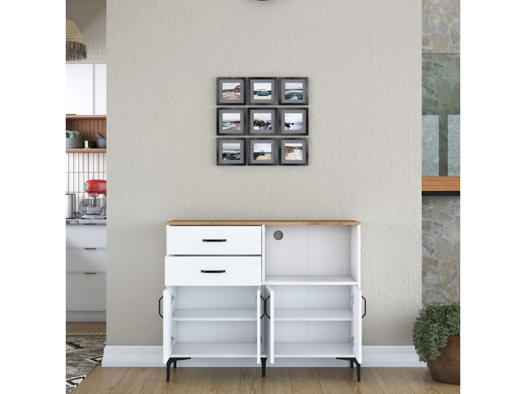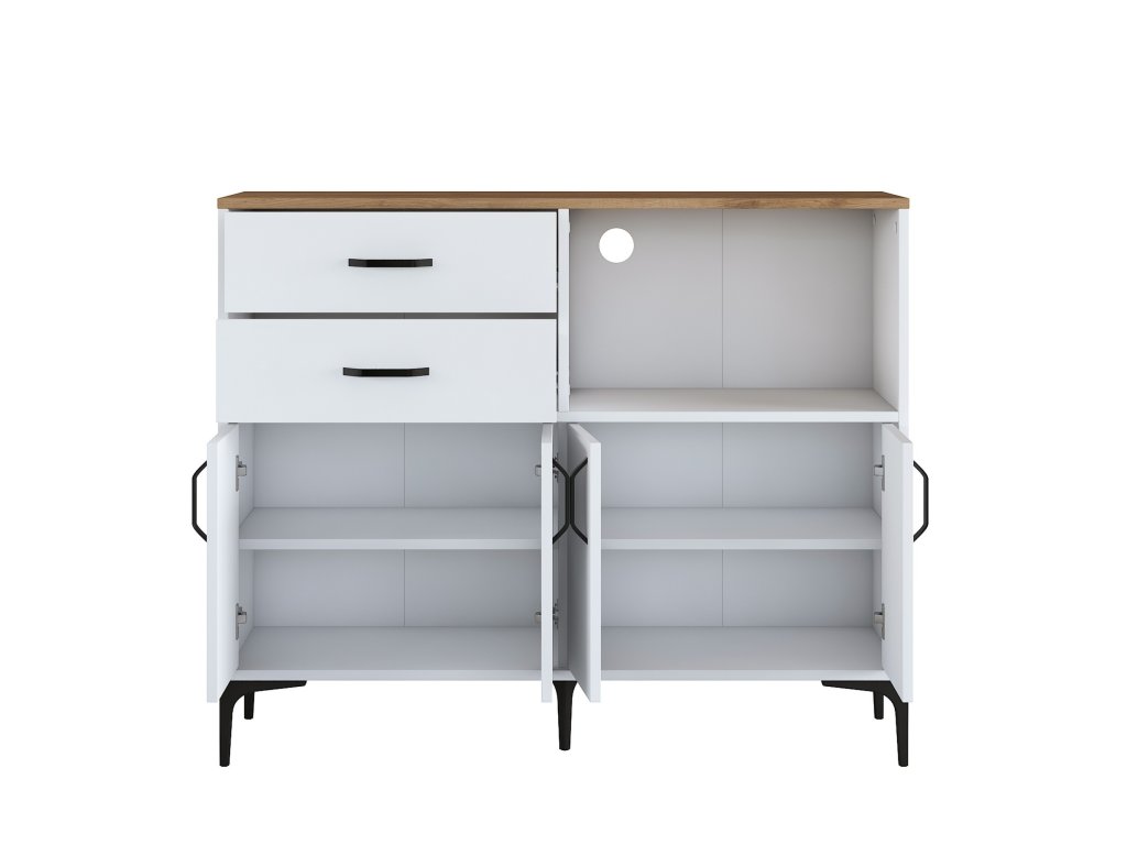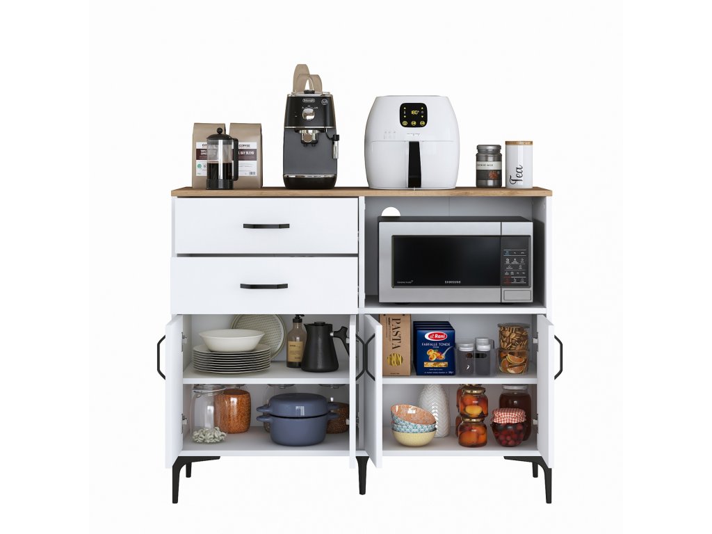 Kuchynská skrinka ODER ponúka kombináciu úložných priestorov v podobe štyroch plných dvierok, dvoch zásuviek a praktického regálku. Horná časť je navrhnutá tak, aby pohodlne pojala mikrovlnnú rúru alebo ďalšie kuchynské spotrebiče. Skrinka je viacúčelová, čo znamená, že sa ľahko prispôsobí vašim potrebám.