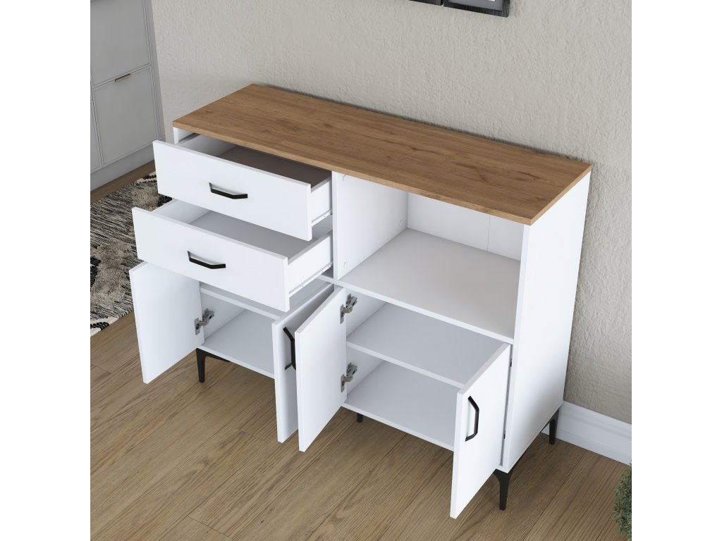 - Vybavenie: 2 zásuvky, 4 plné dvierka a regálok