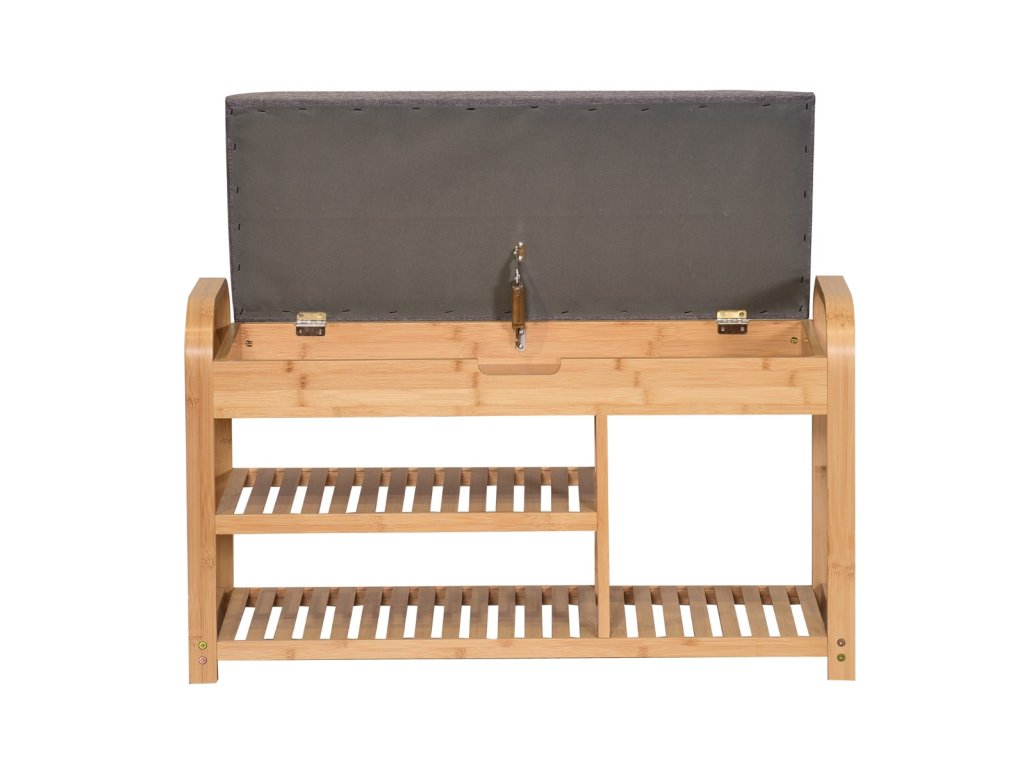 Botník so sedákom BAMBOO vďaka svojim rozmerom nezaberie príliš veľa miesta ale ponúka dostatok úložného priestoru pre všetky Vaše topánky. Tento botník so sedákom je vyrobený z masívneho bambusového dreva v prírodnom odtieni. Sedák je v cene a je čalúnený kvalitnou poťahovou látkou v šedej farbe. Botník so sedákom je otvorený a obsahuje dve priestranné police pre dostatok topánok.