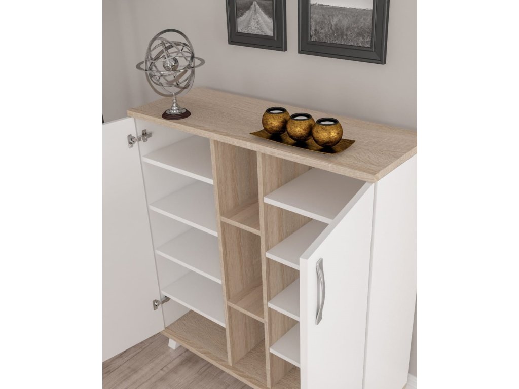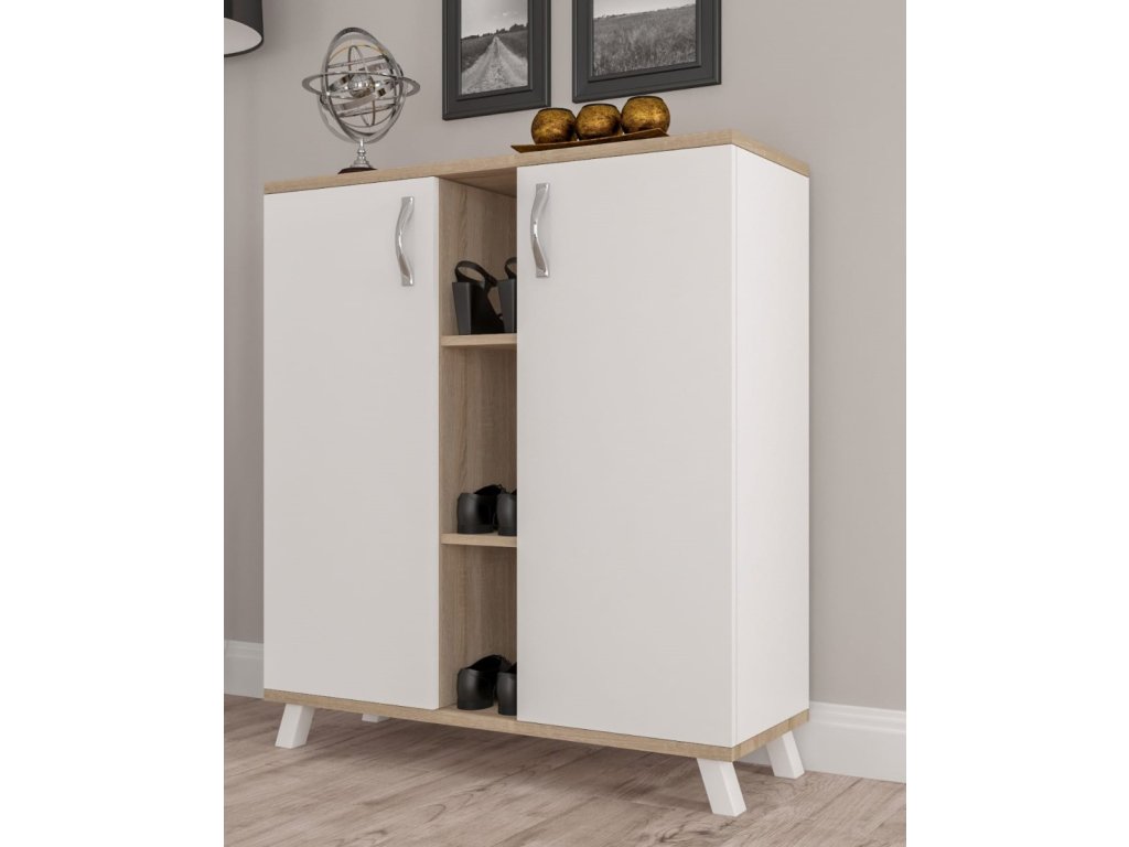 Botník je vybavený 2 dvierkami, za ktorými sa nachádzajú 4 police na usporiadanie vašich topánok. Uprostred sú praktické voľné regálky pre ľahký prístup a uskladnenie. Stojí na elegantných nožičkách, čo uľahčuje údržbu podlahy pod ňou. Vyrobená z kvalitnej drevotriesky potiahnutej melamínom, skrinka na topánky STELA zaisťuje dlhú životnosť a odolnosť.