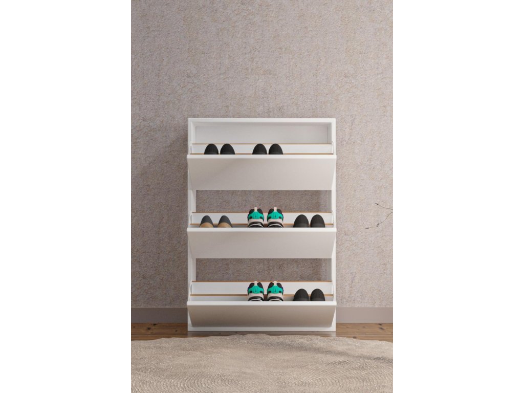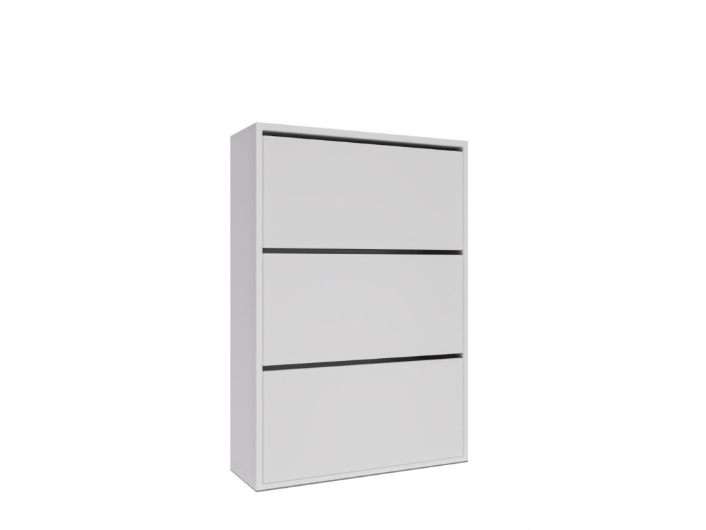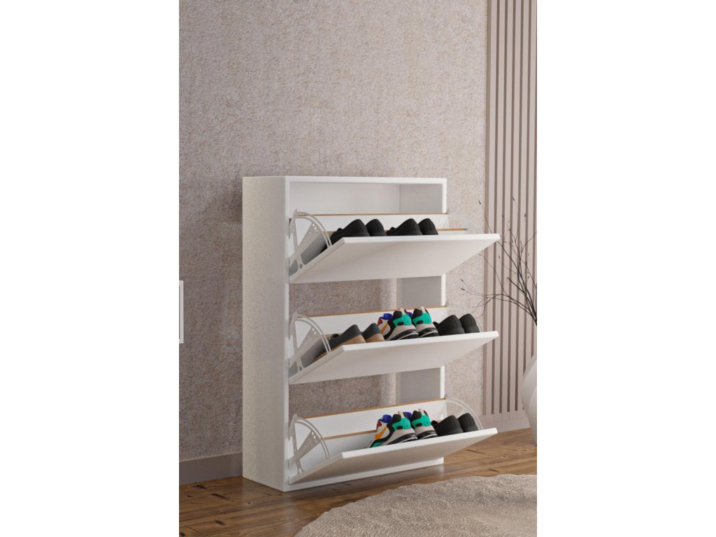 Botník VISTON je vybavený 3 výklopnými priehradkami, ktoré poskytujú dostatok úložného priestoru pre vaše topánky a uľahčujú ich organizáciu. Vyrobená z kvalitnej drevotriesky potiahnutej melamínom, skrinka na topánky VISTON zaisťuje dlhú životnosť a odolnosť.