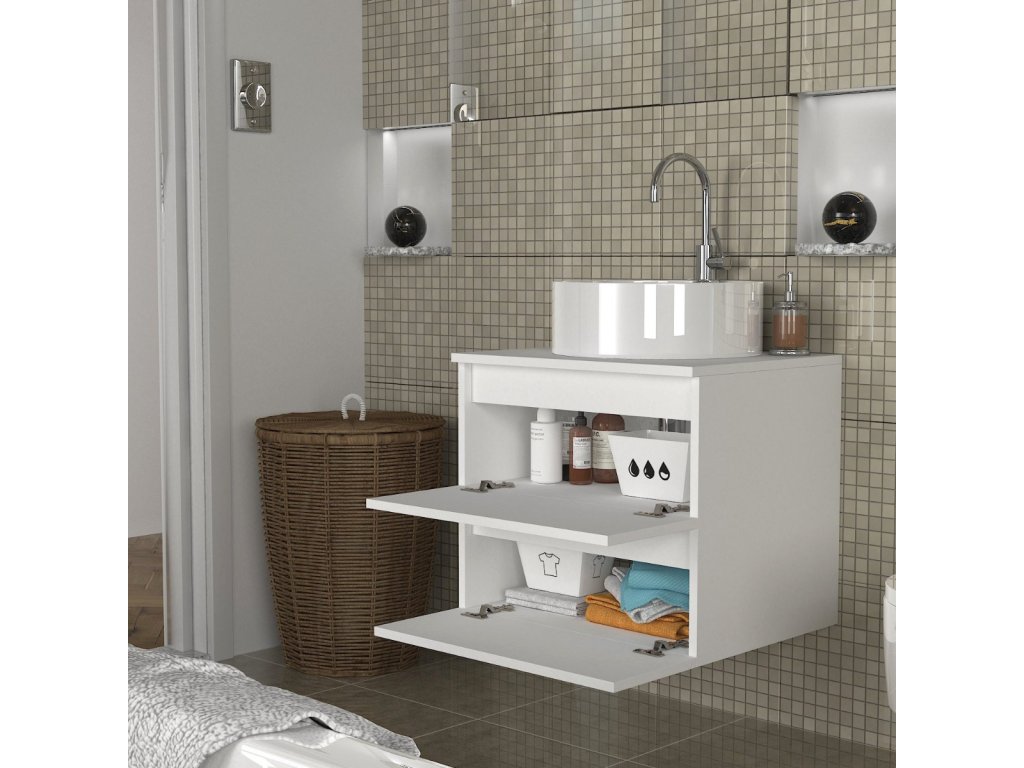 Moderná závesná skrinka pod umývadlo CARMELA zútulní Vašu kúpeľňu a poskytne Vám bohatý úložný priestor v podobe dvoch priehradok s výklopnými dvierkami, čím vyplní priestor pod umývadlom, ktoré by inak zostalo nevyužité.