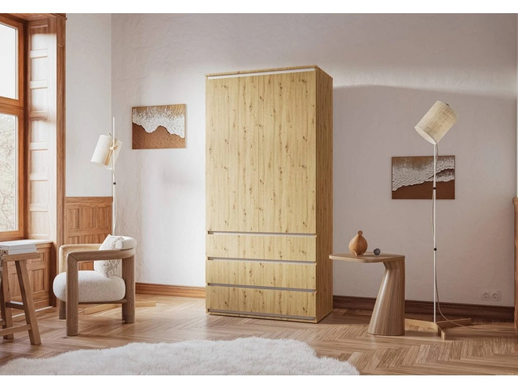 Model má optimálne vnútorné usporiadanie: sekcia s kovovou tyčou na vrchné oblečenie, 4 police na bielizeň alebo doplnky a tri priestranné výsuvné zásuvky pre pohodlné uloženie drobností. Tento dizajn umožňuje efektívne usporiadať priestor aj v malých priestoroch.