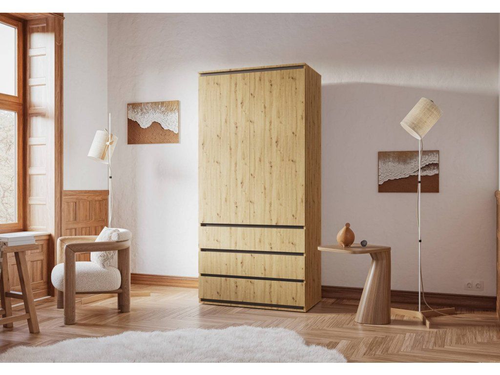 Model má optimálne vnútorné usporiadanie: sekcia s kovovou tyčou na vrchné oblečenie, 4 police na bielizeň alebo doplnky a tri priestranné výsuvné zásuvky pre pohodlné uloženie drobností. Tento dizajn umožňuje efektívne usporiadať priestor aj v malých priestoroch.