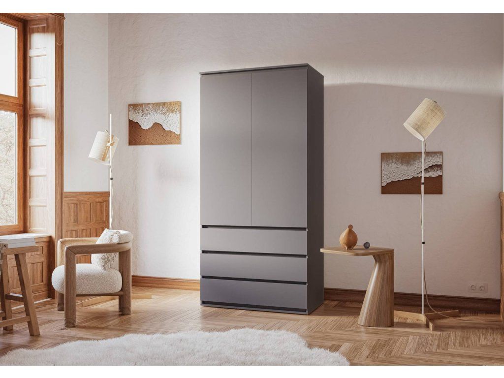 Model má optimálne vnútorné usporiadanie: sekcia s kovovou tyčou na vrchné oblečenie, 4 police na bielizeň alebo doplnky a tri priestranné výsuvné zásuvky pre pohodlné uloženie drobností. Tento dizajn umožňuje efektívne usporiadať priestor aj v malých priestoroch.