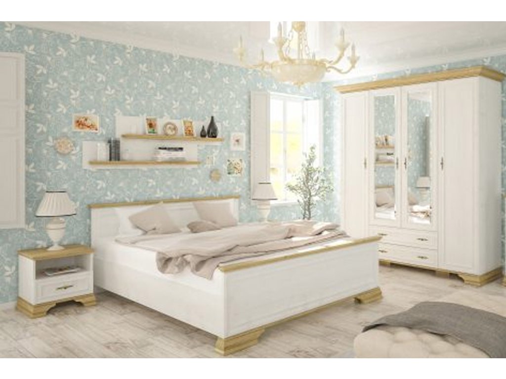 JARMANKA spálňová zostava je štýlový nábytok s rustikálnym nádychom. Jeho štýlové prevedenie je podfarbené kombináciou kontrasných farieb borovice anderson a dub zlatý. Svetlé farby rozjasnia priestor a opticky ho zväčšia. Efektné úchyty s ornamentom v zlatom farebnom prevedení, dodávajú nábytku šmrnc a eleganciu. Elegantné oblé hrany nájdete na štýlovom prevedení nožičiek aj na dvierkach, hornej zakončovacej lište a čelách postele.