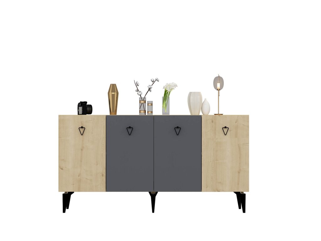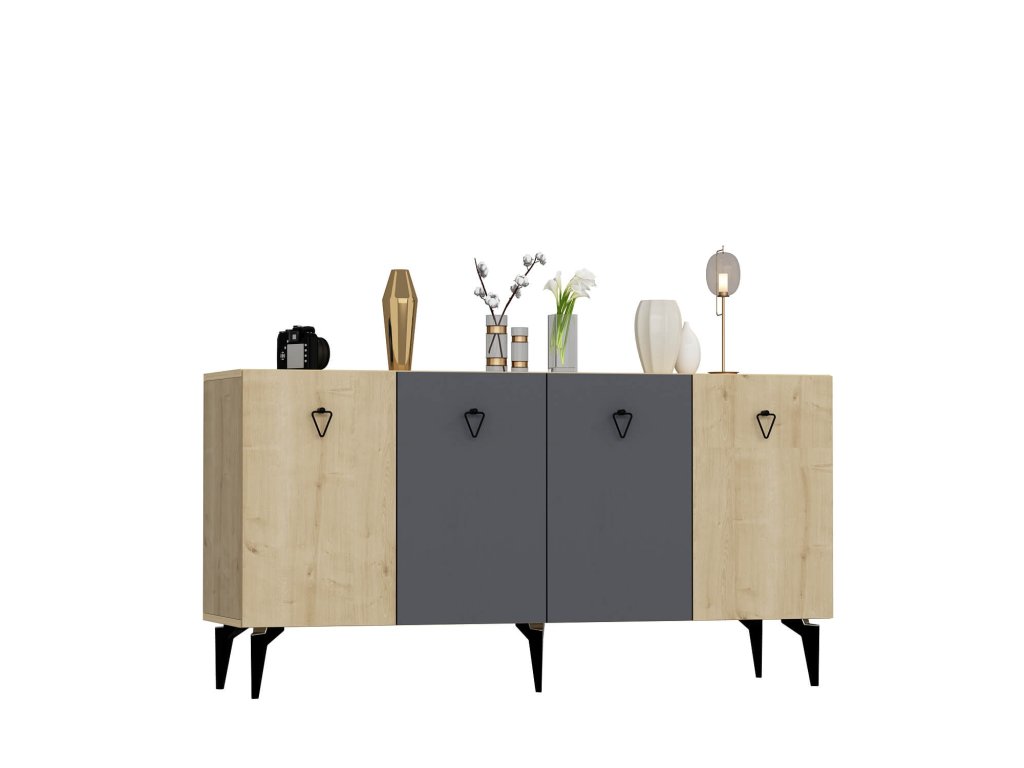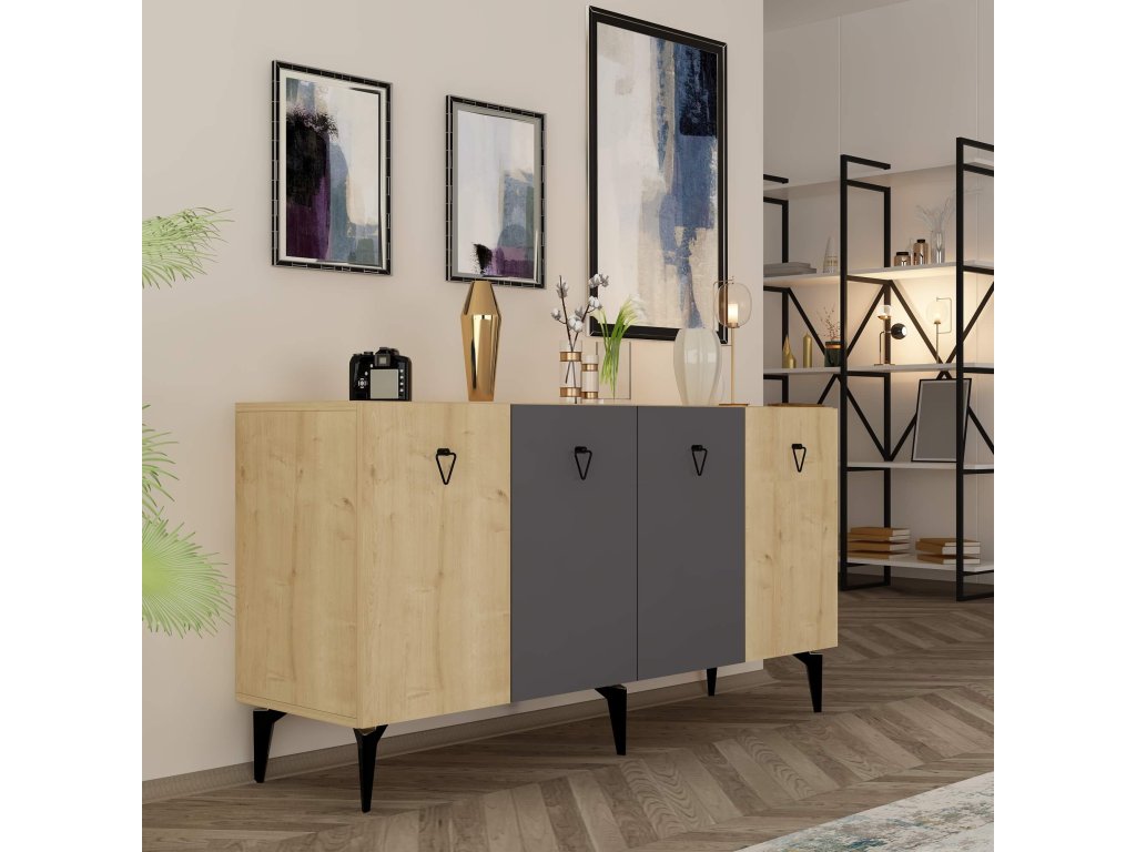 Komoda SONO je ideálnym doplnkom pre modernú obývaciu izbu, ktorá kombinuje praktickosť s elegantným dizajnom. Vďaka štyrom plným dvierkam ponúka dostatok úložného priestoru pre všetky vaše potreby, či už ide o knihy, dekorácie alebo iné predmety. Kombinácia antracitovej a bielej farby dodáva interiéru štýlový a sofistikovaný vzhľad.