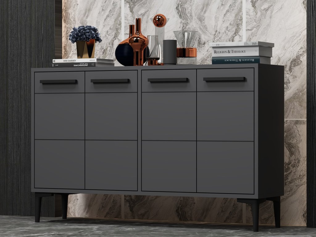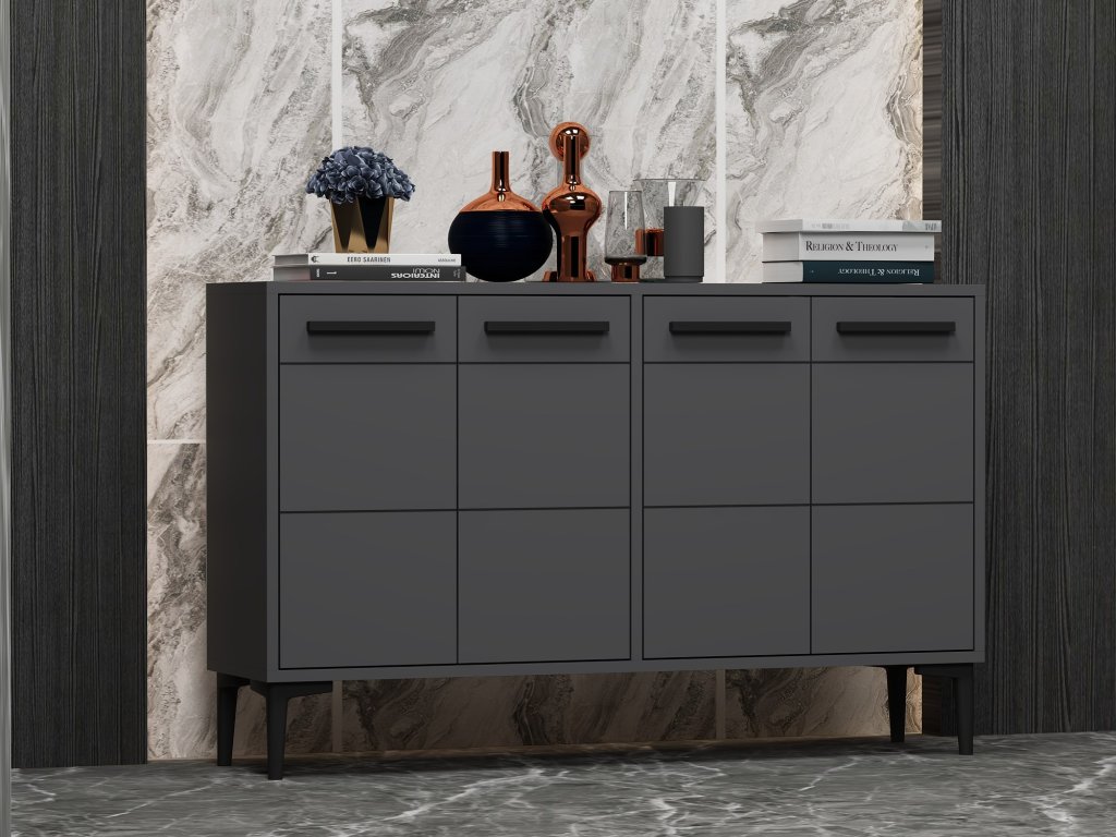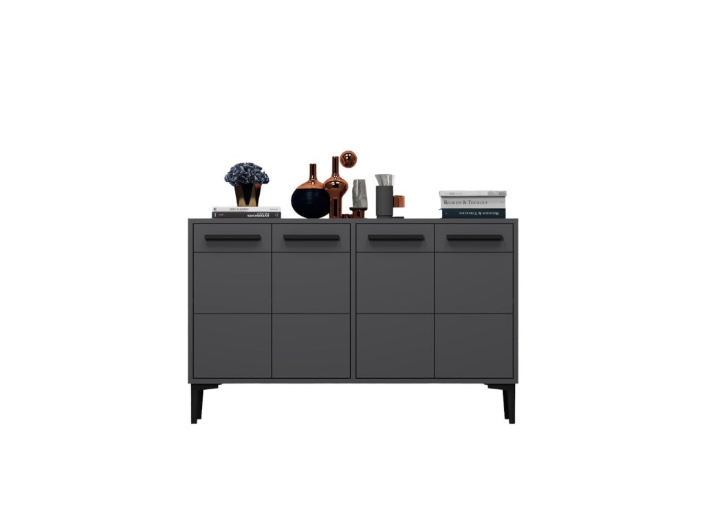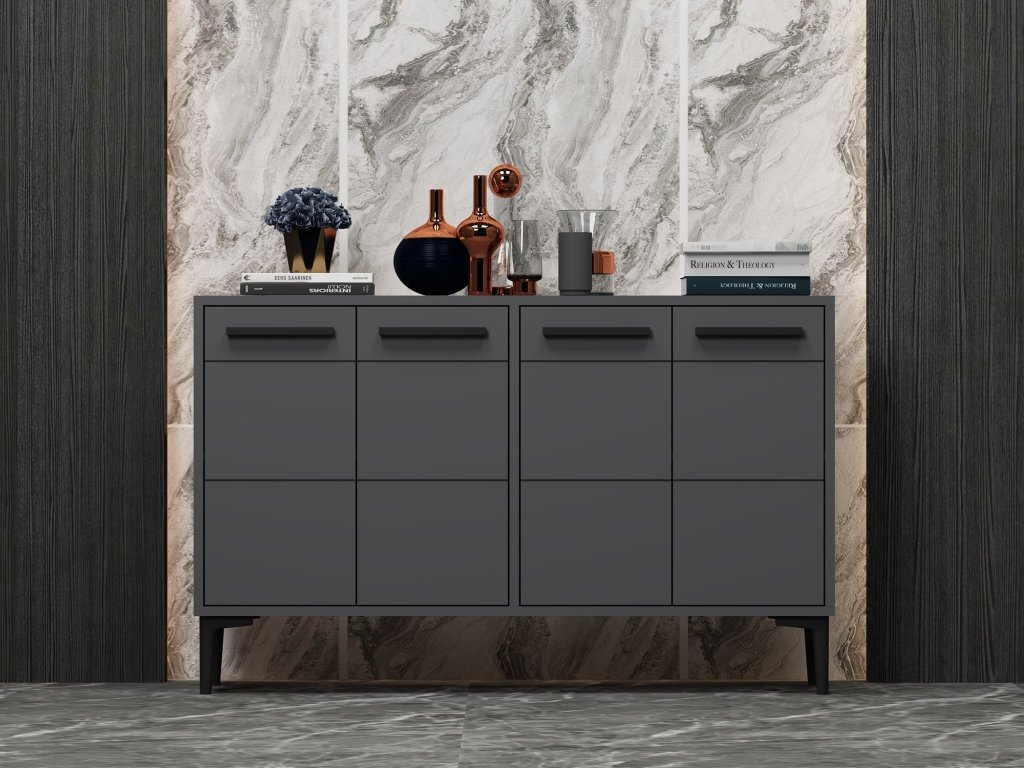 Antracitová farba tejto komody dodá každej miestnosti nádych sofistikovanosti. Čisté línie a minimalistický dizajn z neho robia všestranný kus nábytku, ktorý doplní akýkoľvek štýl interiéru.