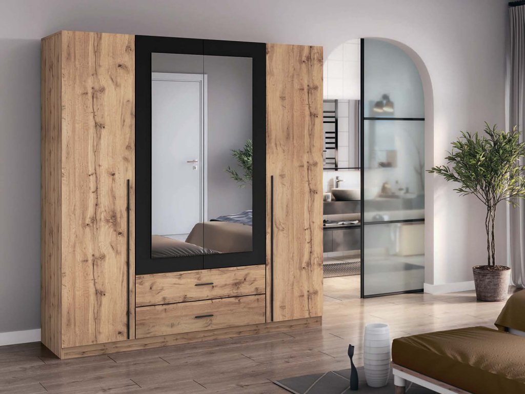 Skriňa má obdĺžnikový tvar a praktické vnútorné usporiadanie. Vybavená je tromi šatníkovými tyčami, ktoré umožňujú pohodlné zavesenie odevov, a dvomi zásuvkami na drobnosti. Súčasťou je aj zrkadlo, ktoré zvyšuje komfort pri každodennom používaní a opticky zväčšuje miestnosť. Vyhotovenie z materiálu LTD zabezpečuje jednoduchú údržbu.