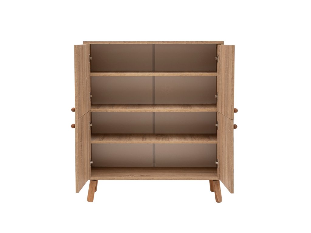 Už vás nebaví preplnené priestory a neusporiadané miestnosti? Nehľadajte nič iné ako našu multifunkčnú skrinku, ktorá vnesie do vášho domova poriadok a štýl. Tento všestranný kus nábytku je navrhnutý tak, aby spĺňal všetky vaše potreby úložného priestoru a zároveň dodal každej miestnosti nádych elegancie. Hrúbka 18 mm zaisťuje robustnosť a stabilitu, zatiaľ čo drevené nohy dodávajú nádych sofistikovanosti. UV lak nielen umocňuje krásu skrinky, ale tiež ju chráni pred poškriabaním a vyblednutím.