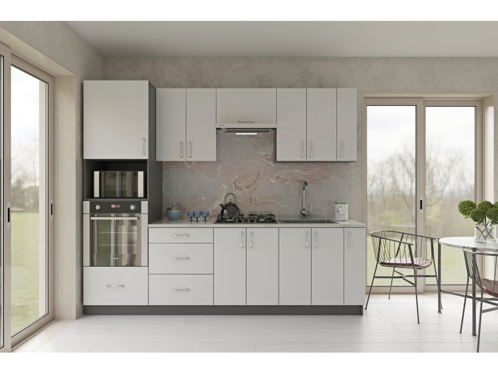 Kuchynské skrinky sú vyrobené z kvalitných LTD dosiek. Ich údržba je nenáročná. Korpus je vo farbe grafitu. Dvierka sú v bielej farbe. Úchyty sú plastové.