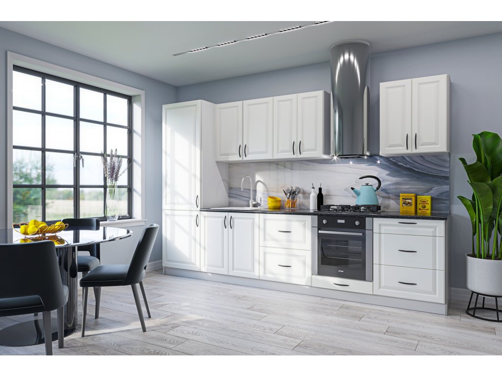 | Zostava obsahuje: | vysoká potravinová skrinka 60/57/214 cm, dolná drezová skrinka 80/82 cm, zásuvková skrinka 60/82 cm, skrinka na vstavanú rúru 60/82 cm, zásuvková skrinka 60/82 cm, horná sk skrinka 60/72 cm |