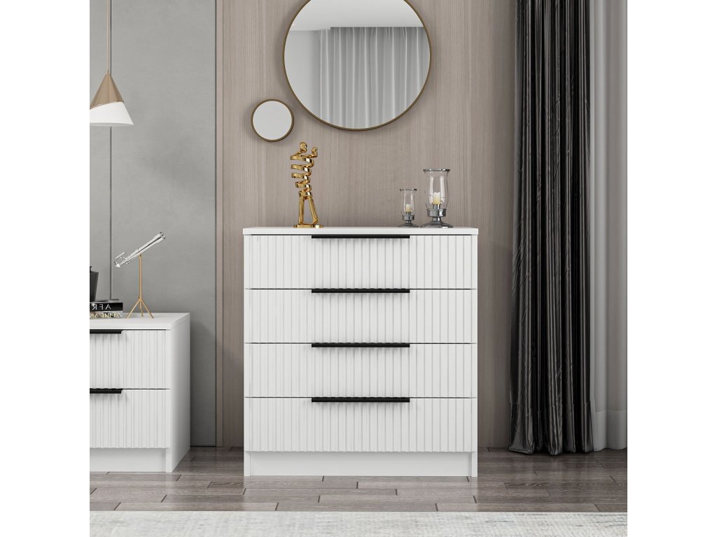 Komoda LUCK v elegantnej bielej farbe je dokonalým doplnkom do modernej obývacej izby. Vďaka štyrom praktickým zásuvkám ponúka dostatok úložného priestoru na organizáciu vašich vecí. Minimalistický dizajn inšpirovaný škandinávskym štýlom dodá vášmu interiéru ľahkosť a nadčasovú eleganciu.
