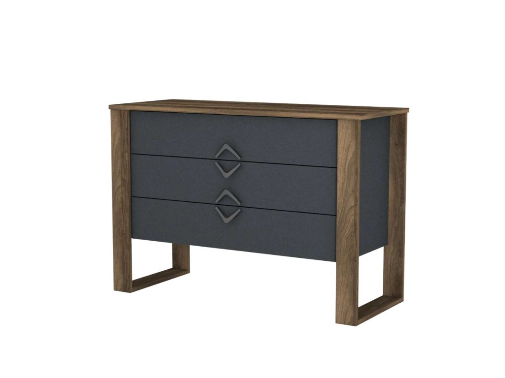 Komoda RANG sa vyznačuje moderným dizajnom, ktorý kombinuje elegantnú orechovú farbu s antracitovými detailmi. S tromi priestrannými zásuvkami ponúka dostatok úložného priestoru pre vaše veci. Materiál LTD s hrúbkou 18 mm zaisťuje pevnosť a dlhú životnosť nábytku.