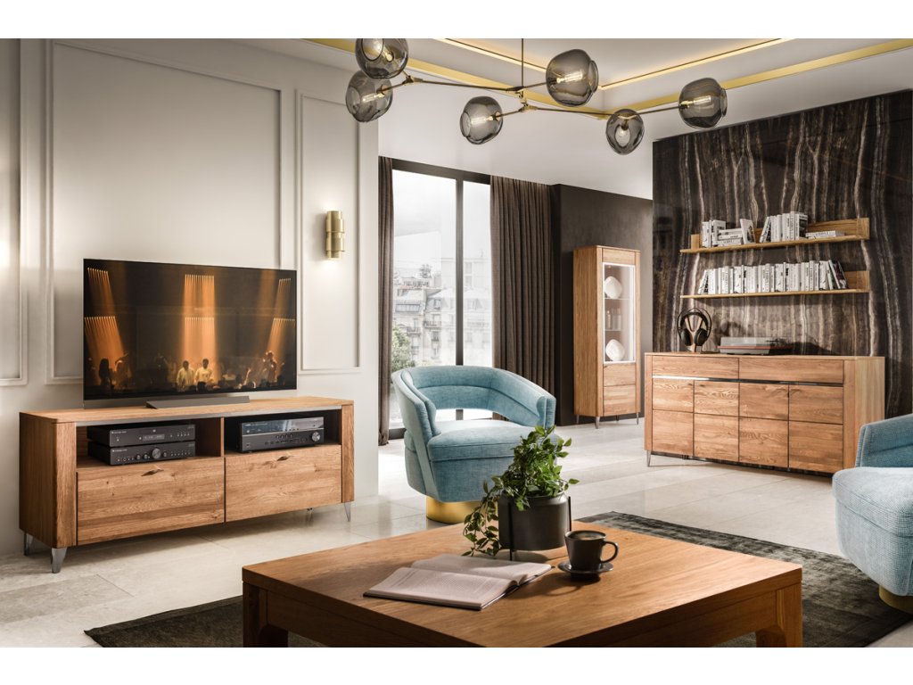 Korpus TV stolíka je vyrobený z prírodnej dyhy. Predná časť je vyrobená z masívu dubového dreva. Úchyty sú pochrómované, v striebornej farbe. Nábytok disponuje vysokými elegantnými nožičkami. Farebné prevedenie: dub medový.