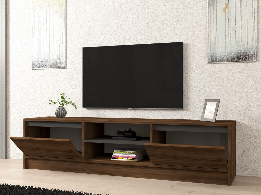 Vďaka svojmu elegantnému dizajnu a modernému vzhľadu je tento televízny stolík perfektným doplnkom každého moderného domova. Jeho orechová a antracitová farba sa bez problémov hodí do akéhokoľvek interiéru a vytvára harmonickú atmosféru, ktorá vyžaruje teplo a noblesu.