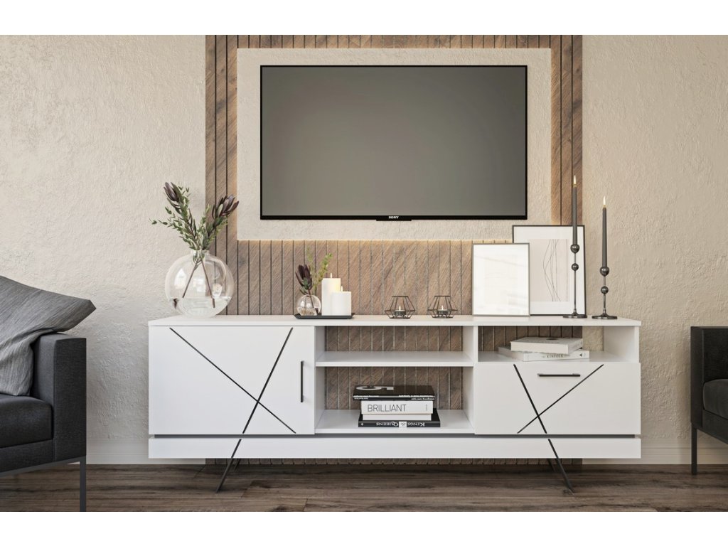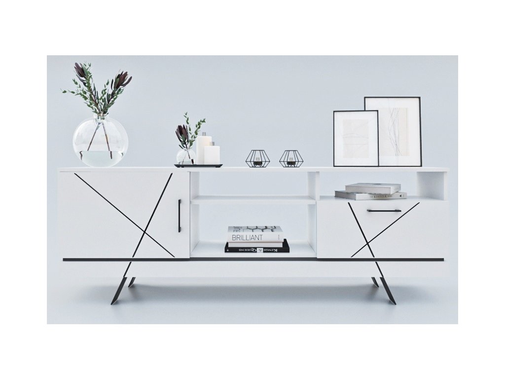 Televízny stolík GEOM poteší všetkých milovníkov industriálneho štýlu. Nadčasová biela farba vytvára príjemný kontrast s čiernymi dekoratívnymi pásmi na čelách nábytku as kovovými úchytmi. Čierne kovové nohy dodávajú stolíku nielen moderný ráz, ale predovšetkým stabilitu.