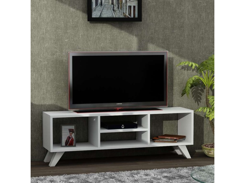 Objavte JAREP, TV stolík, ktorý je vďaka svojmu minimalistickému dizajnu a čistej bielej farbe ideálny pre moderné obývacie izby. Tento kus nábytku poskytuje priestor na uloženie vašich multimediálnych zariadení a ďalších predmetov, a to všetko bez zbytočných komplikácií vďaka svojmu otvorenému designu.
