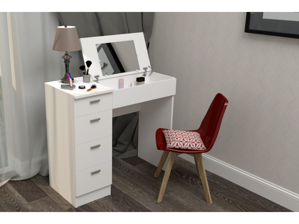 GLAMOR je netypický stolík s viacnásobným využitím. V základnej polohe ho viete využiť ako klasický písací stôl. Po otvorení výklopnej dosky so zrkadlom z neho máte za pár sekúnd praktický toaletný stolík. Oceníte aj viac šuplíkov, vhodných na odloženie rôznych predmetov - či už kozmetického alebo iného charakteru. LTD dosky, ktorá nie je náročná na údržbu. Farebné prevedenie: biela. Úchyty sú plastové, vo farebnom prevedení matný chróm.