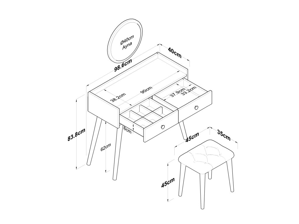- Vybavenie: 2 zásuvky, zrkadlo a taburetka