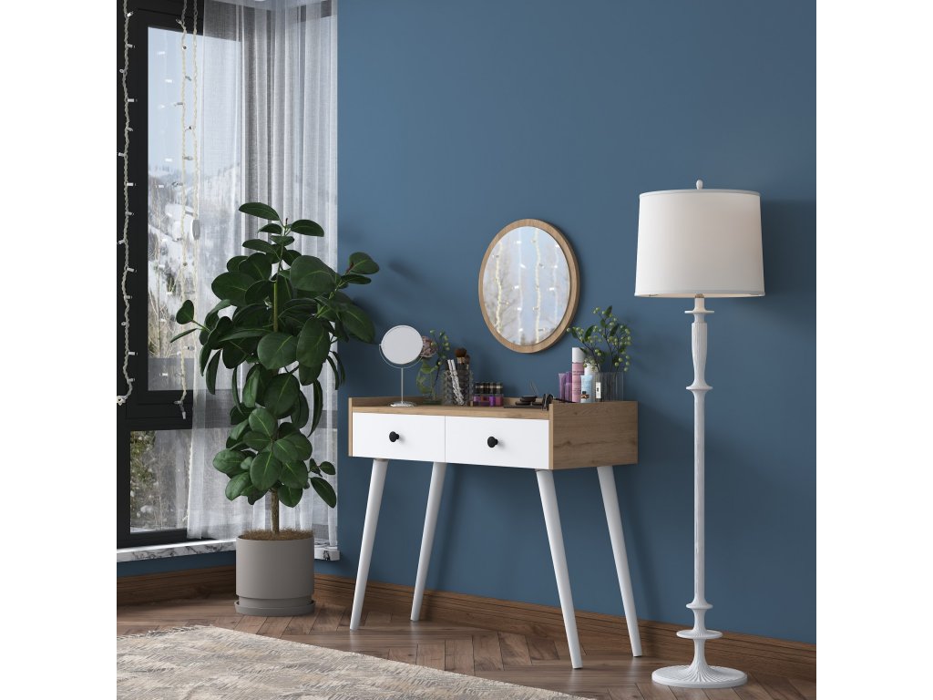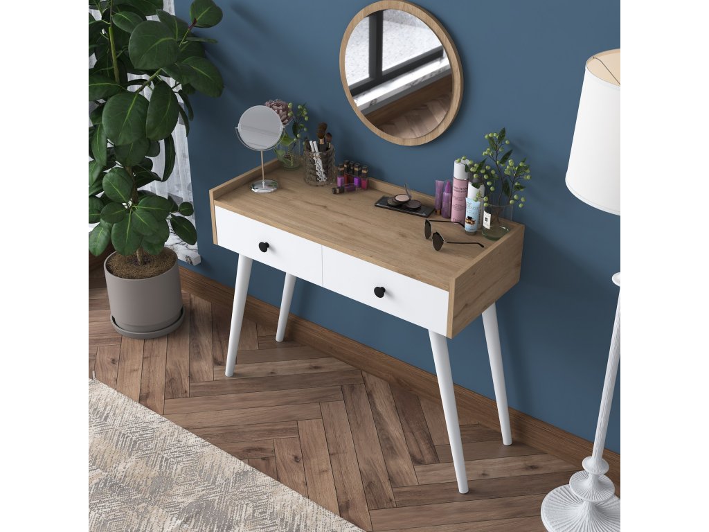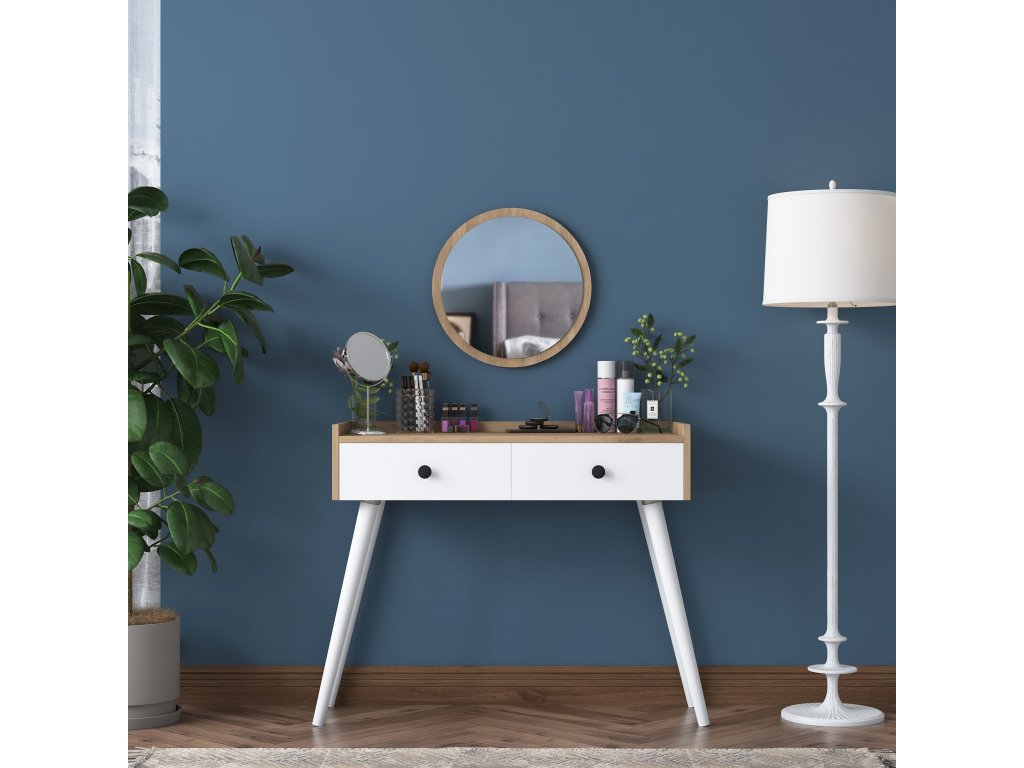 BIDEN je štýlový toaletný stolík, ktorý prináša eleganciu a funkčnosť do každej spálne. Vďaka kombinácii dubového dekoru a bielej farby pôsobia moderne a harmonicky, skvele zapadne do akéhokoľvek interiéru.