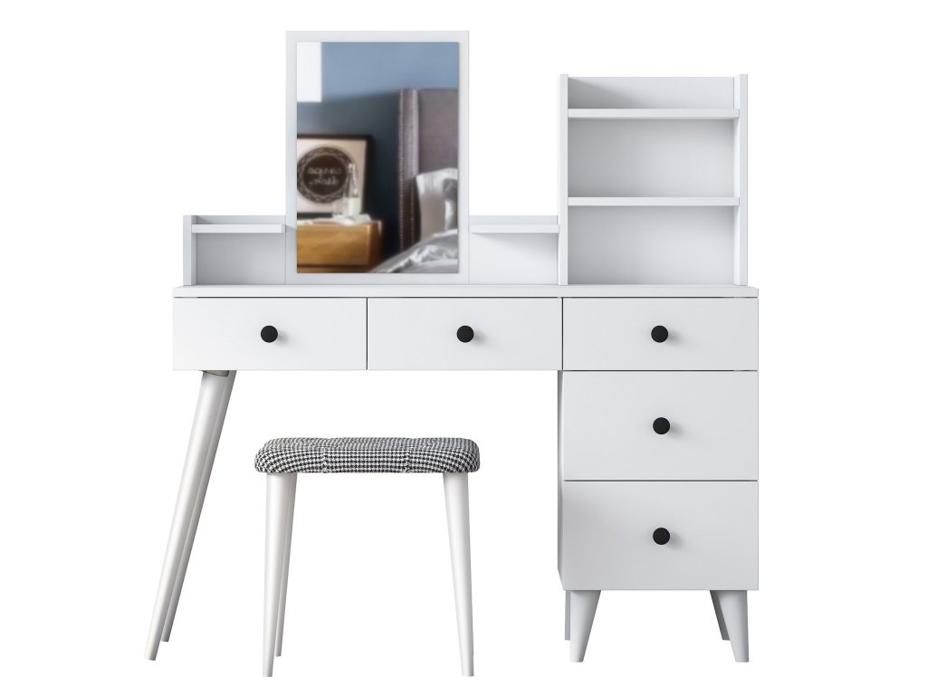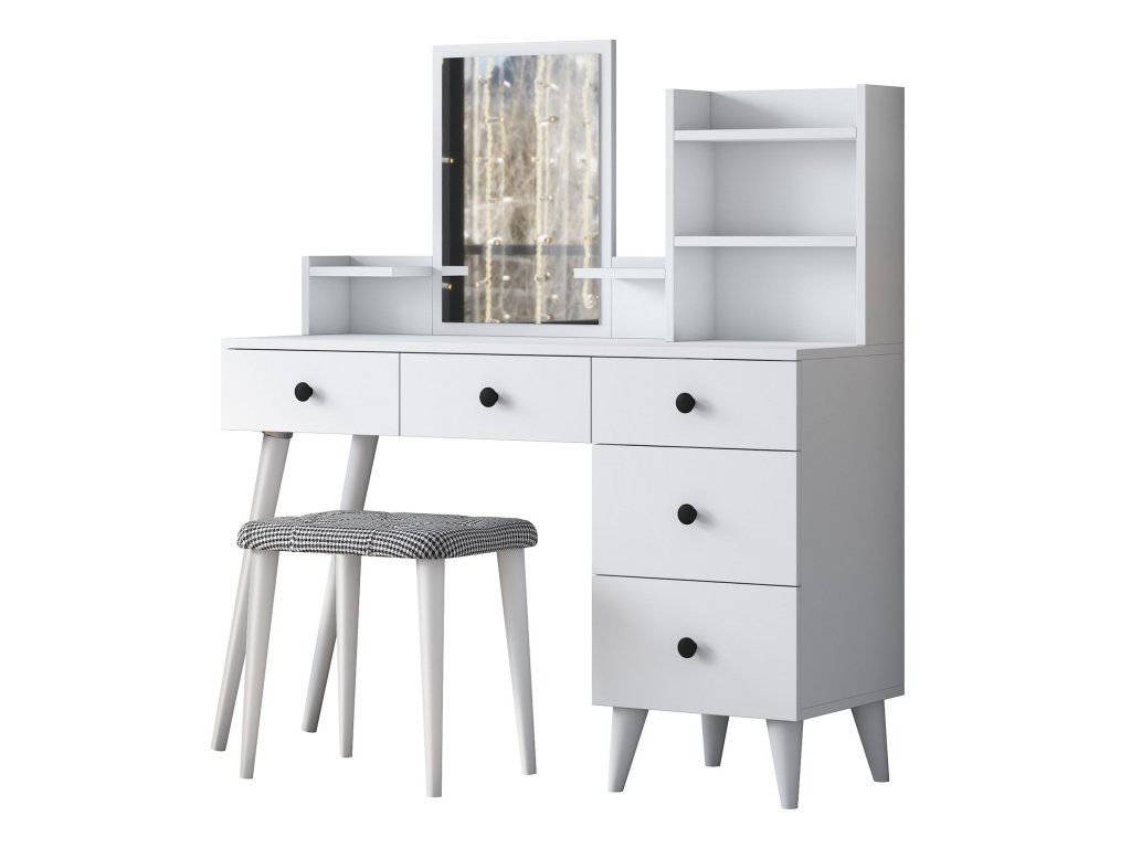 Toaletný stolík FURY je praktickým a štýlovým doplnkom do každej modernej spálne. Vďaka svojmu škandinávskemu dizajnu a čisto bielemu prevedeniu prináša sviežosť a eleganciu. S piatimi zásuvkami, zrkadlom a pohodlnou taburetkou spĺňa všetky vaše potreby pre každodennú starostlivosť.