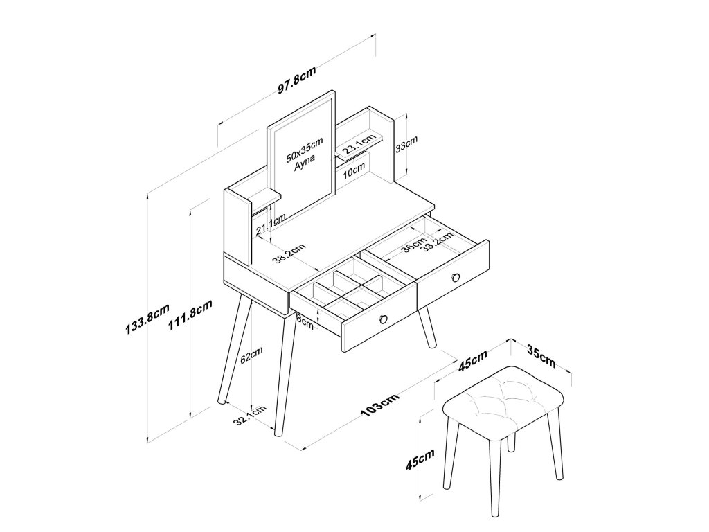 - 2 zásuvky na uloženie kozmetiky, šperkov alebo iných nevyhnutností.