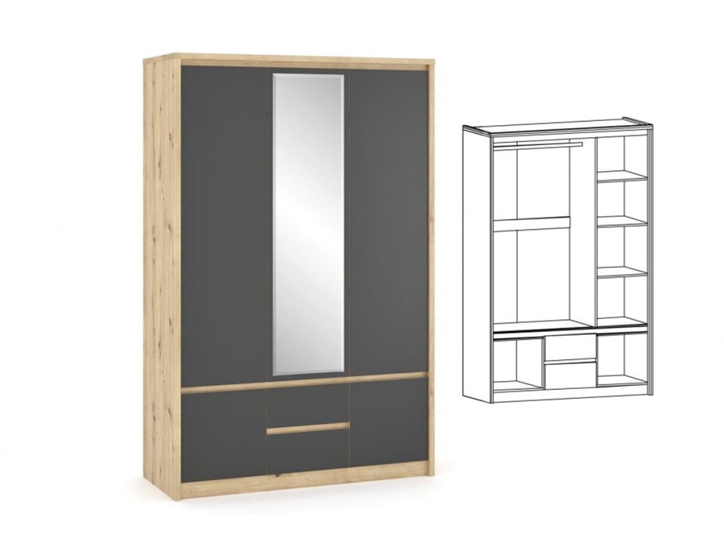 DOMICA šatníková skriňa patrí medzi trojdverové skrine. Zaujímavosťou tohto nábytku je vizuál štruktúry dreva, ktorý je viditeľný na doskách vo farbe artisan. Dvojfarebné prevedenie zvýrazňuje jej vzhľad. Zrkadlo umiestnené na stredových dverách dodá nábytku šmrnc a priestor opticky zväčší.