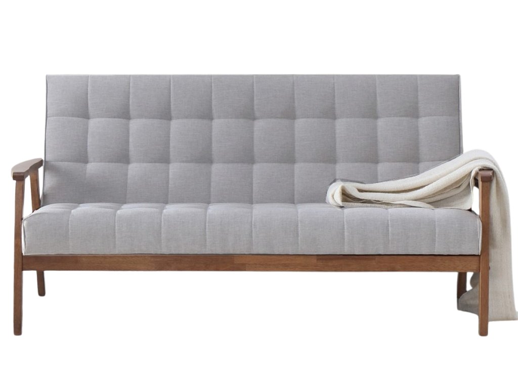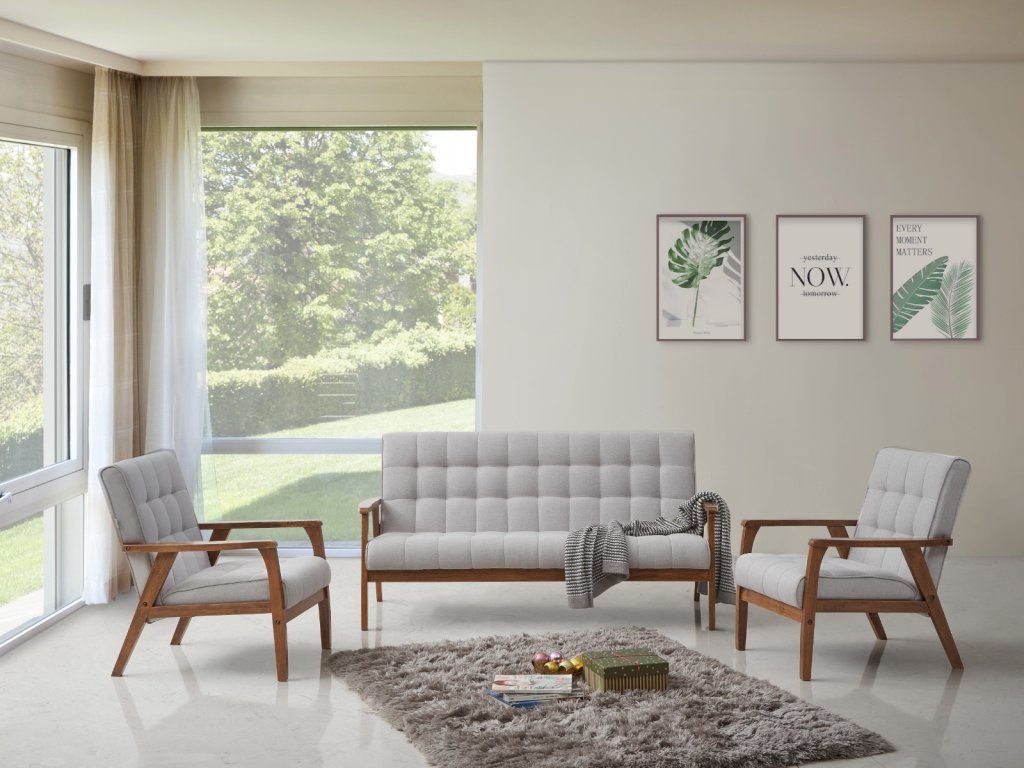 Trojsedák PETRONELA III v modernom jednoduchom prevedení s nádychom retra. Má drevené nožičky spojené s drevenými podrúčkami. Farebných odtieň dreva - orech. Sedacia časť je čalúnená šedou látkou, výrazné prešívanie dodáva kreslu atraktívny vzhľad. Pohodlné sedenie zaručujú použité materiály: PUR pena v kombinácii pružnými čalunickými pásmi. Výška sedu je 40 cm a hĺbka sedu je 52 cm. Výška podrúčok je vo vyššom bode 53 cm a v nižšom bode 51 cm. Rozmery (š/h/v): 162 x 75 x 81 cm. Dodávame v demontovanom stave. V našej ponuke nájdete aj kreslo a celú zostavu PETRONELA, vďaka ktorej si dokážete zariadiť obývačku v retro štýle.Dodatočné parametre