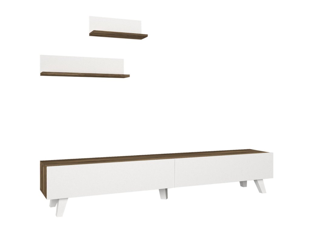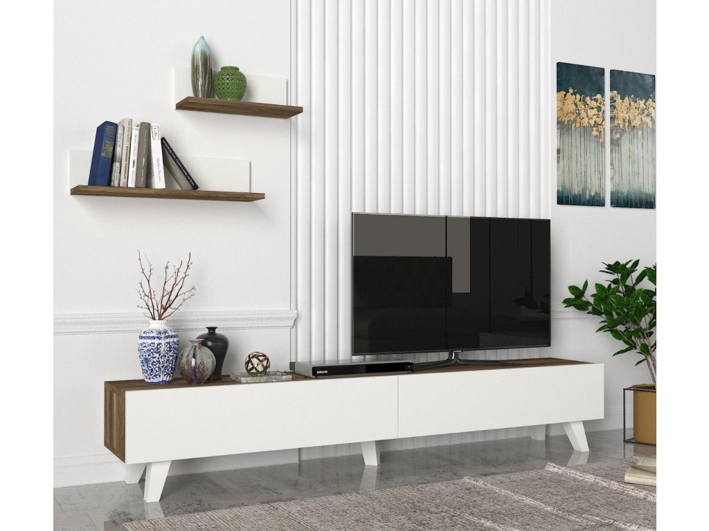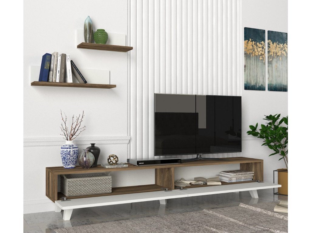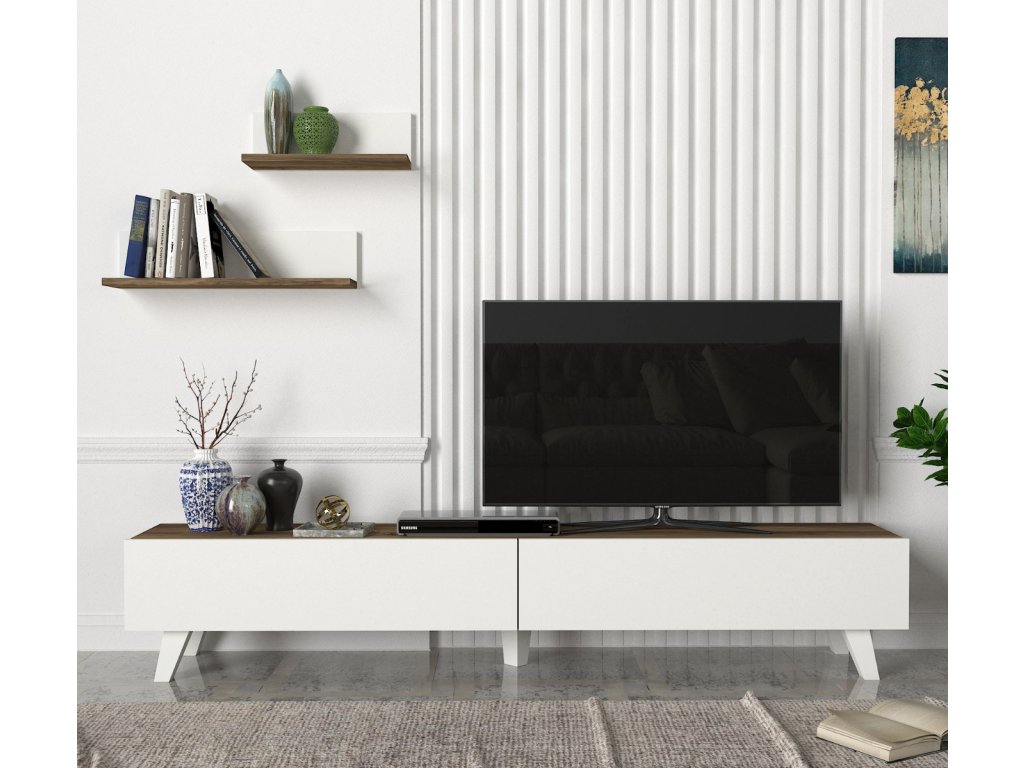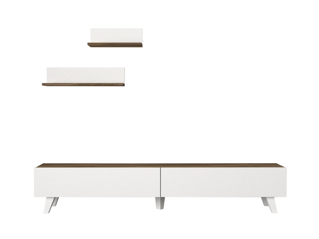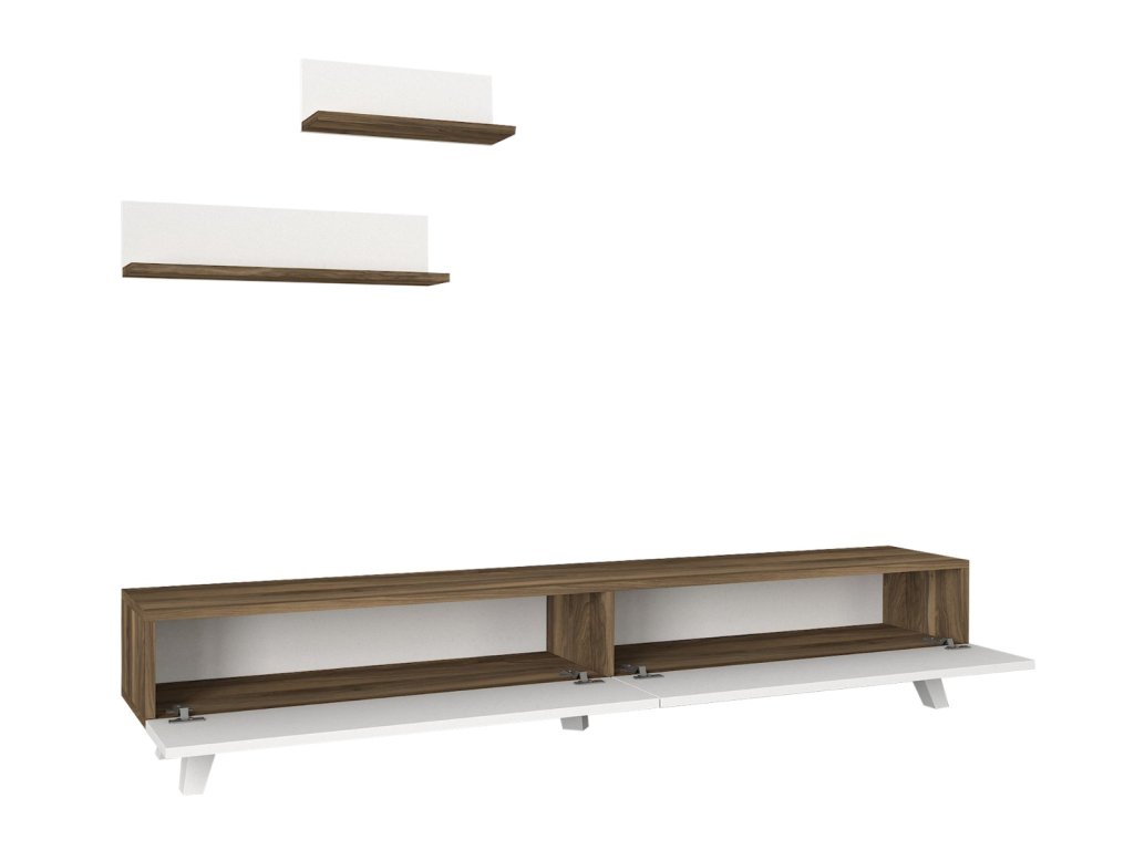 Štýlový TV stolík na nožičkách AZIA vás očarí svojím minimalistickým dizajnom a priaznivou cenou. Tento nábytok je charakteristický prírodnou kresbou dreva, ktorá je doplnená bielymi modernými nožičkami. TV skrinka poskytuje dostatok úložného priestoru vo forme skriniek s výklopom. Bonusom sú závesné police v cene, ktoré ideálne poslúžia na vystavenie dekorácií či kníh.
