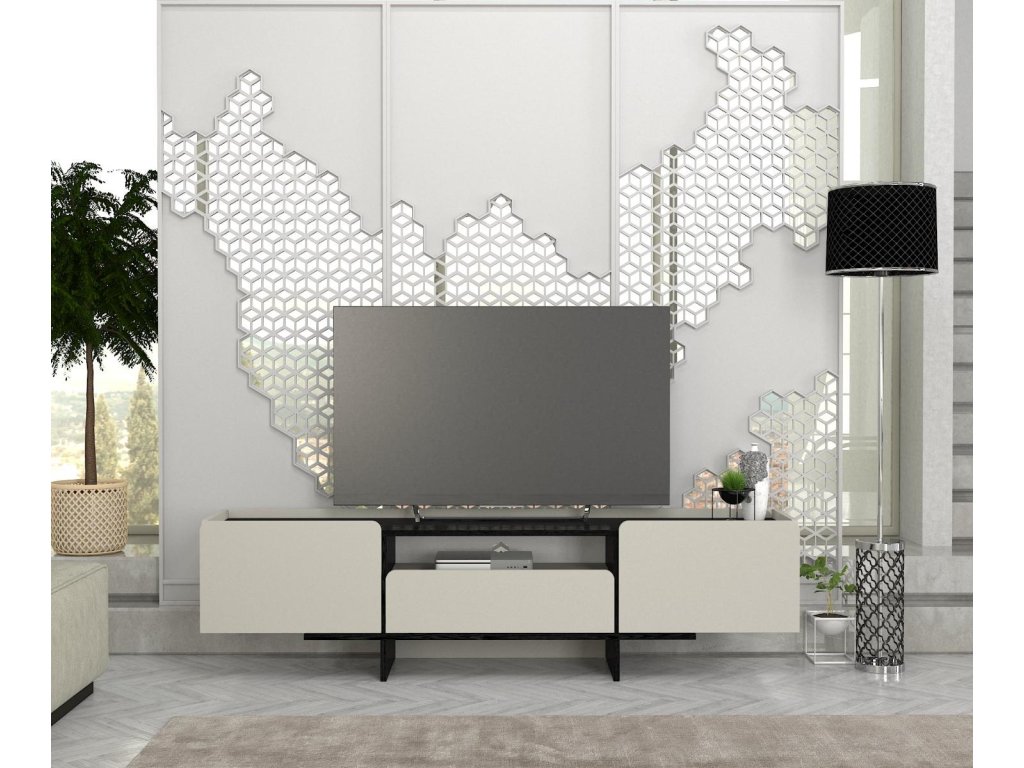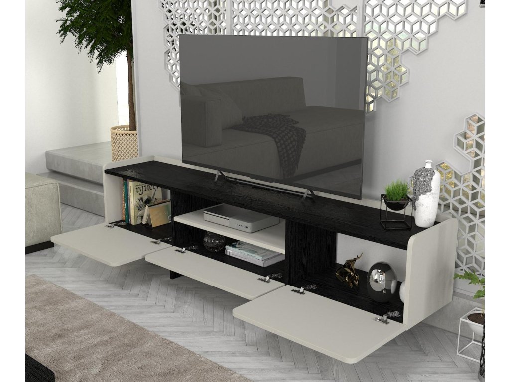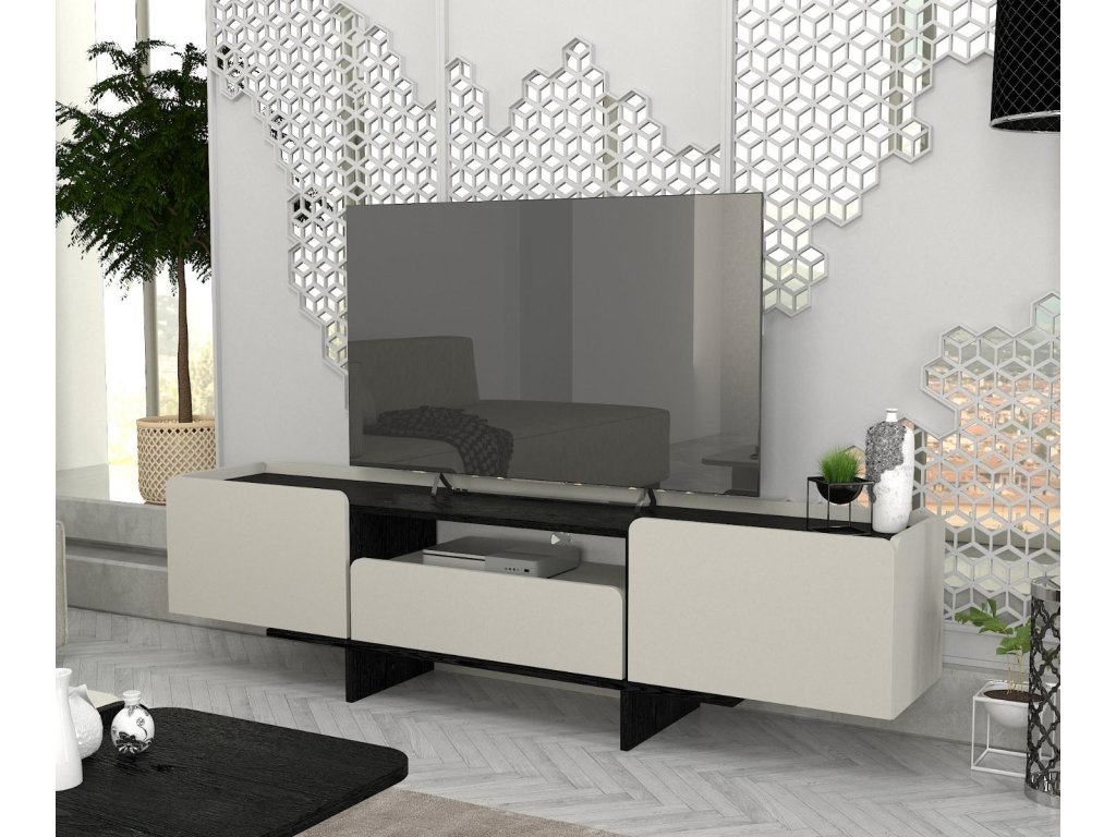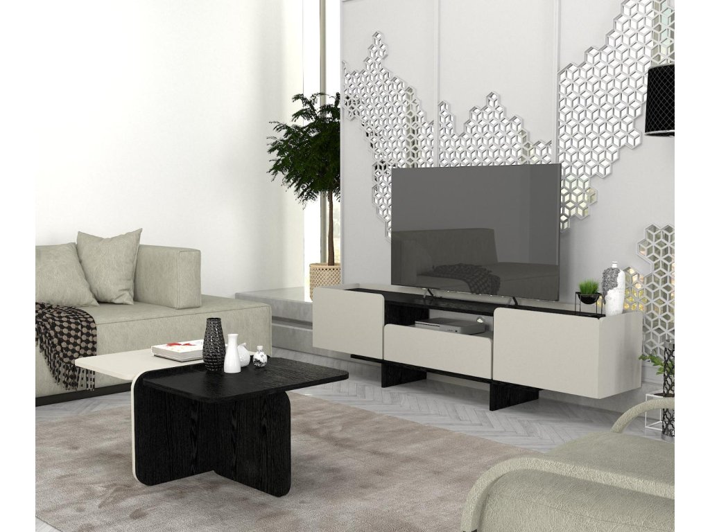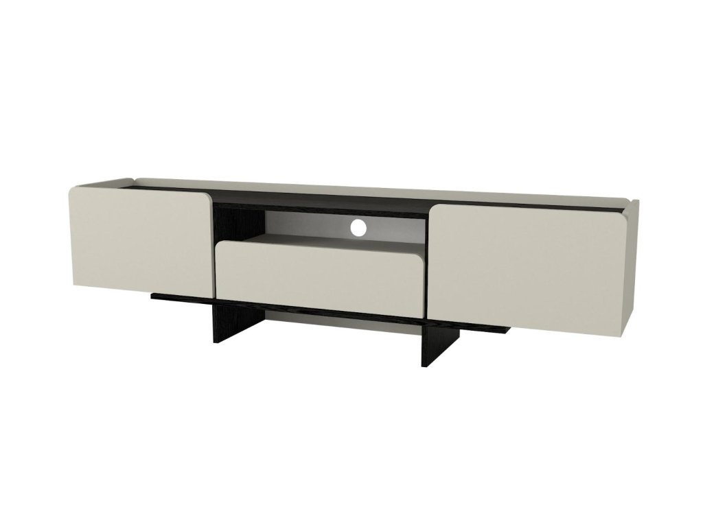 Televízny stolík REGAN ponúka dostatok úložného priestoru vďaka trom dvierkam, za ktorými sa nachádzajú praktické skrinky, a odkladacím policam pre vaše elektronické zariadenia a dekorácie. Vyrobený z kvalitného materiálu LTD s hrúbkou 18 mm, zaisťuje tento stolík pevnosť a dlhú životnosť. Kombinácia čiernej a béžovej farby pridáva vašej obývačke moderný a sofistikovaný vzhľad.