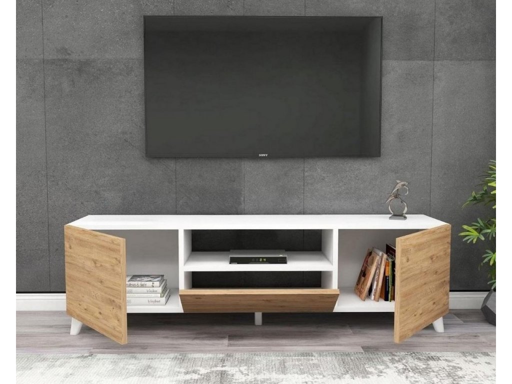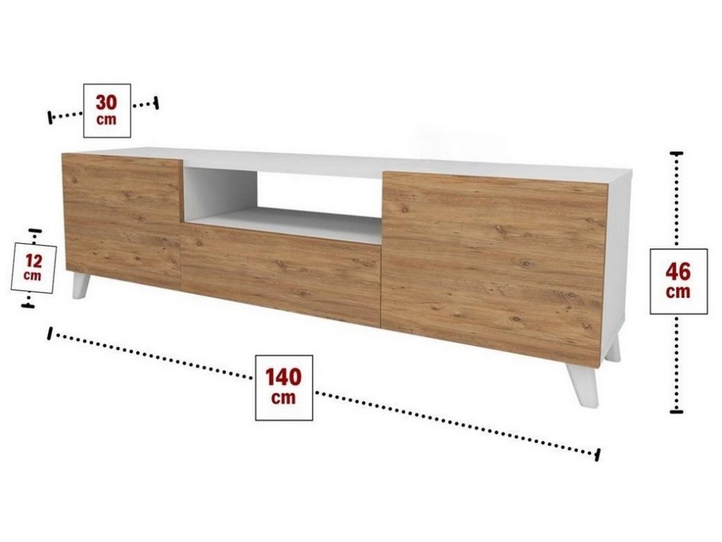 Televízna skrinka je dvojdverová. Tiež má jednu otvorenú zložku a výklopné dvierka. Rozmery: Šírka: 140 cm Hĺbka: 30 cm Výška: 46 cm Výška nožičky: Výška nožičky: demontovanom stave.