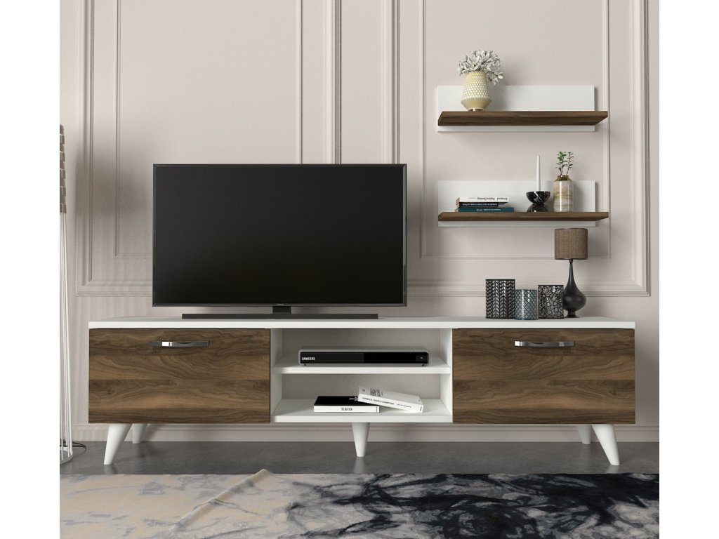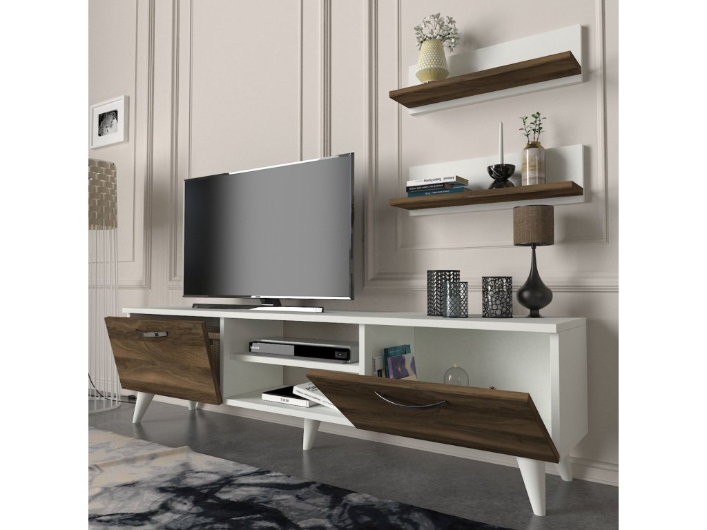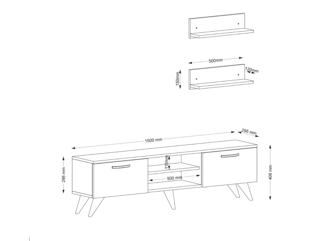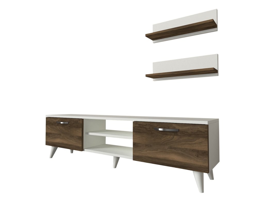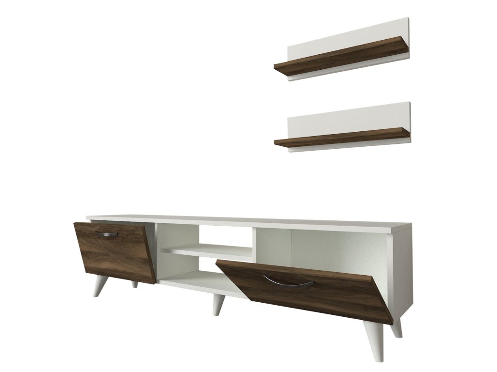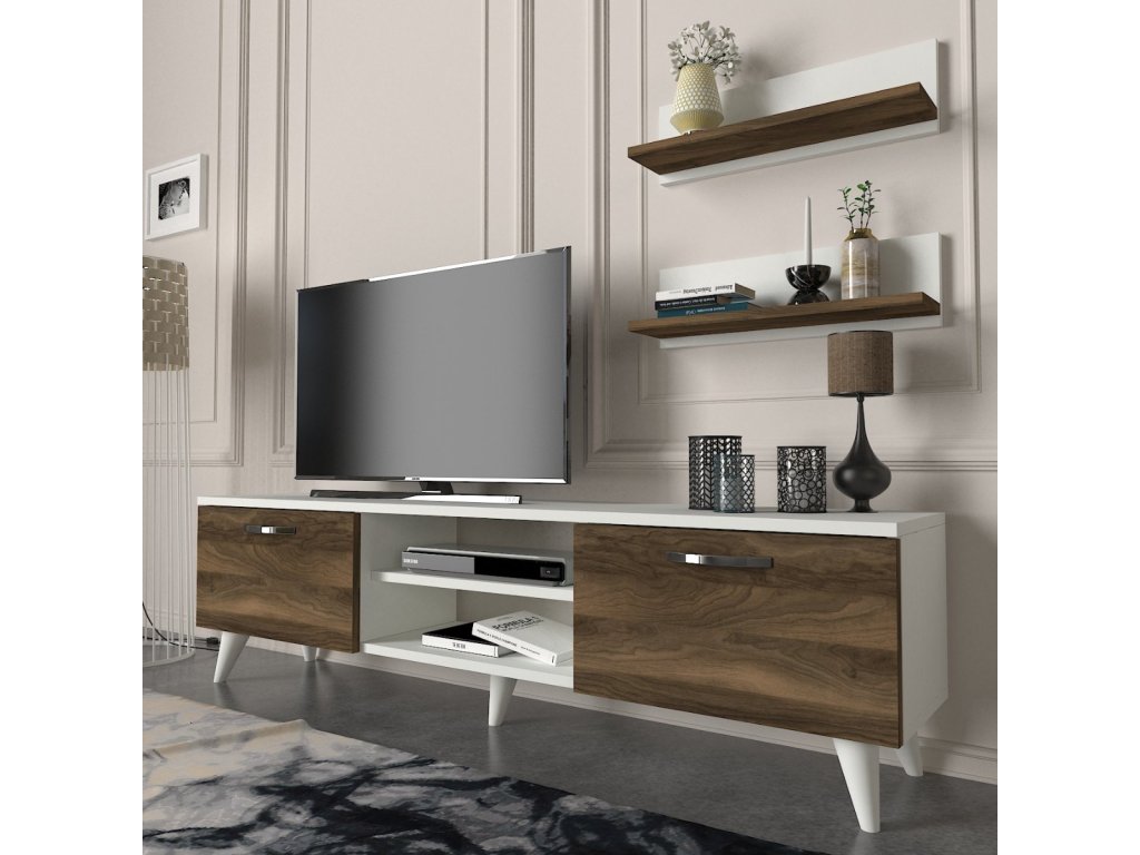 TV skrinka poskytuje dostatok úložného priestoru vo forme skriniek s výklopom. V strednej časti sú dve otvorené police na uloženie wifi routera a podobne. V cene sú tiež dve závesné police.
